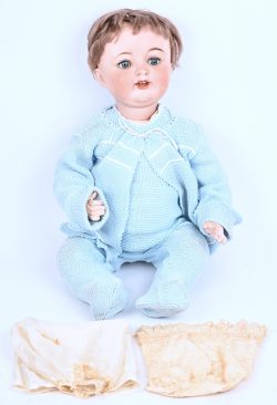 #194Een antieke pop met porseleinen hoofd. Met open mond en slaapogen. Gemerkt op het hoofd 6789/40, Germany. Toegevoegd slaapkleedje en muts van zijde met kant.