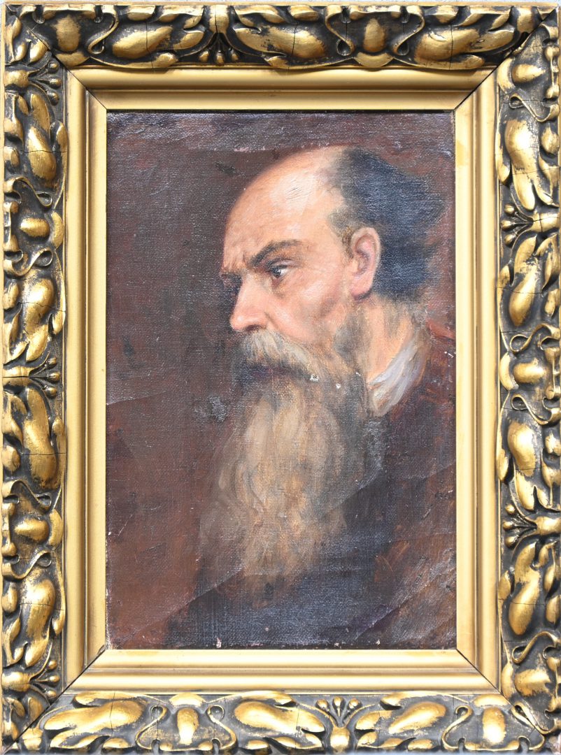 "Balding man with beard", a portrait, oil on canvas, bearing the name Ilja Repin on the back, with old restorations.
