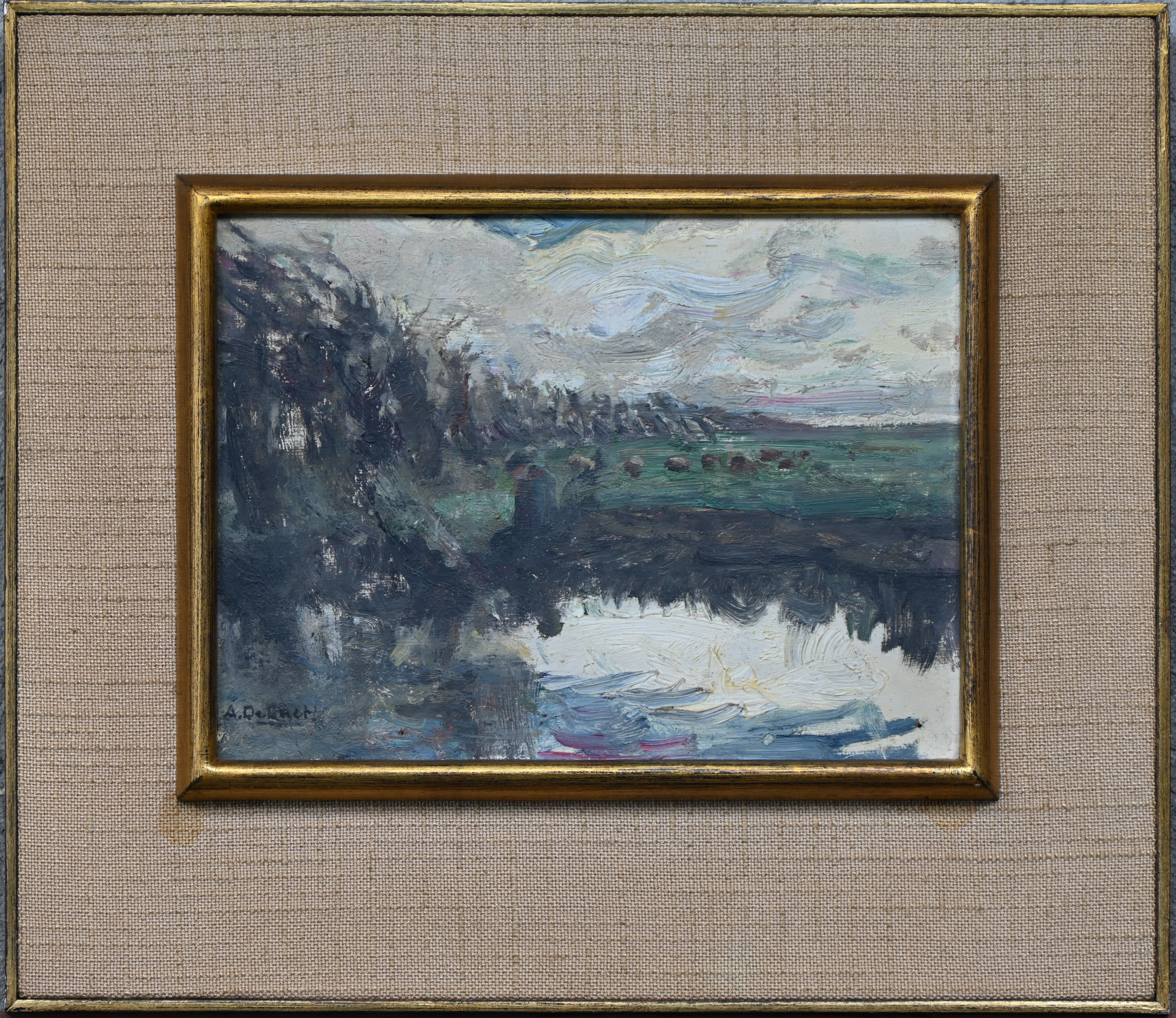 'Landscape with house', an oil study on panel. Signed A. De Laet. -