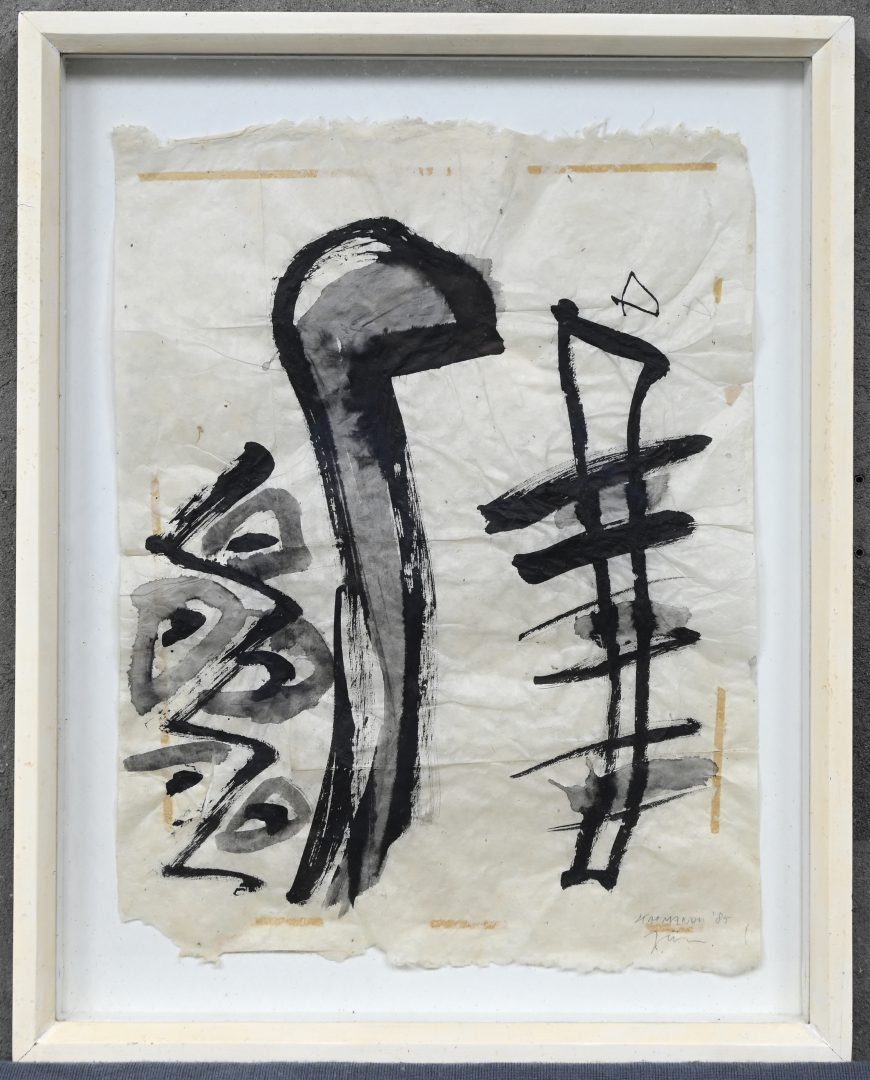 #359Gerrit Lakmaaker‘Abstracte compositie’, gemengde techniek van hoogdruk, acryl en potlood op papier. Getekend Lakmaaker 1990, nr. 16 uit een oplage van 25 exemplaren.