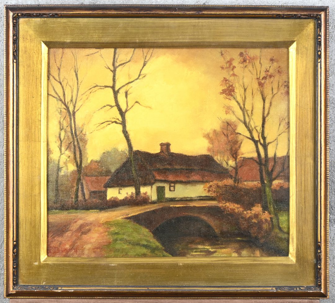 #174Adrien Paul Duerinckx‘Witte hoeve met kruisbeeld’, olieverf op doek. Getekend; A. P. Duerinckx. Met een beetje schade aan de verflaag.