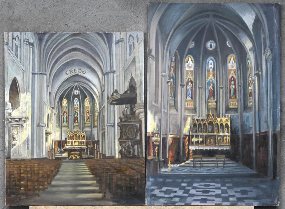‘Kerkelijke interieurs’, twee olieverfschilderijen op doek. Getekend J. Maris.