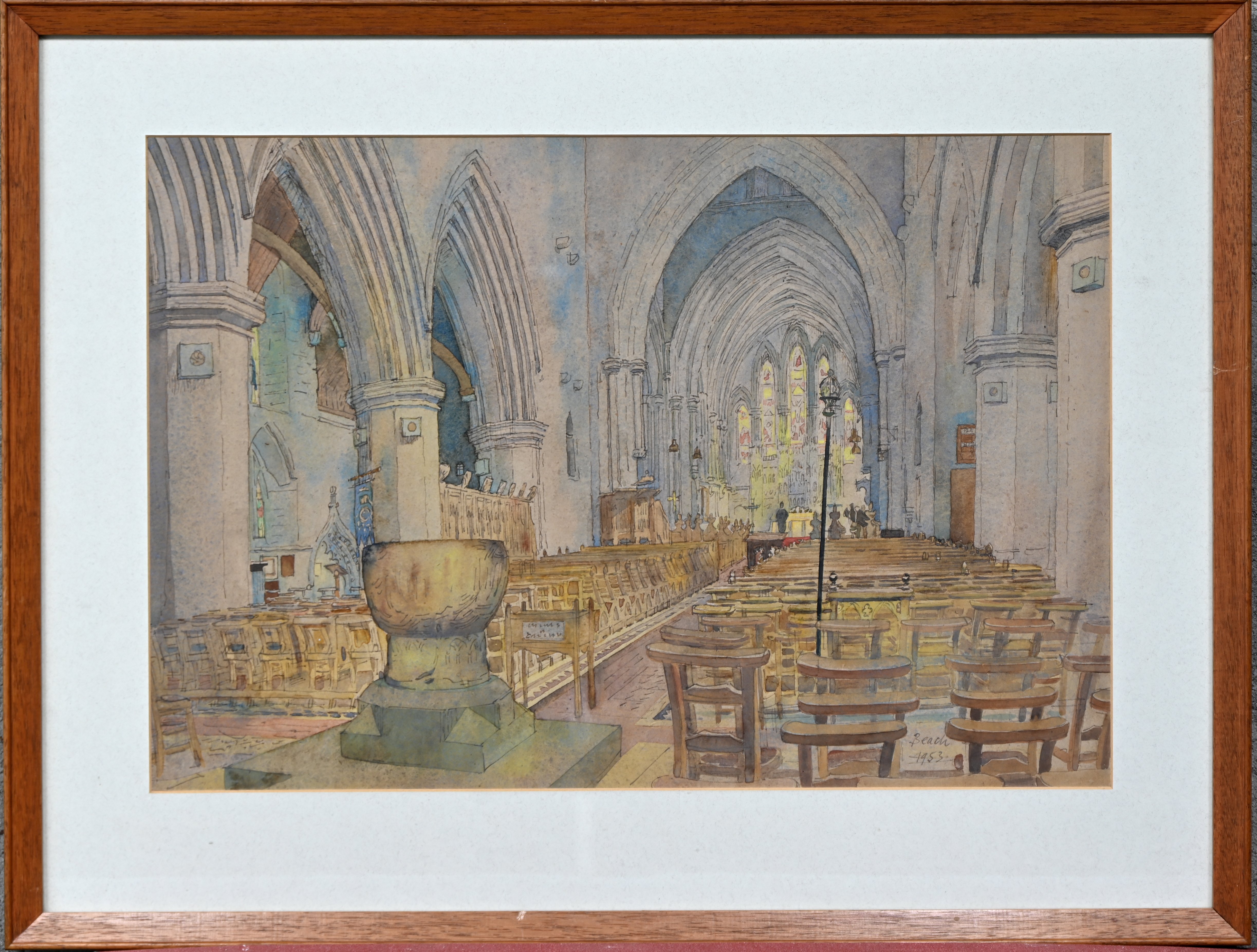 ‘Kerkinterieur’, een aquarel getekend Beach 1953.
