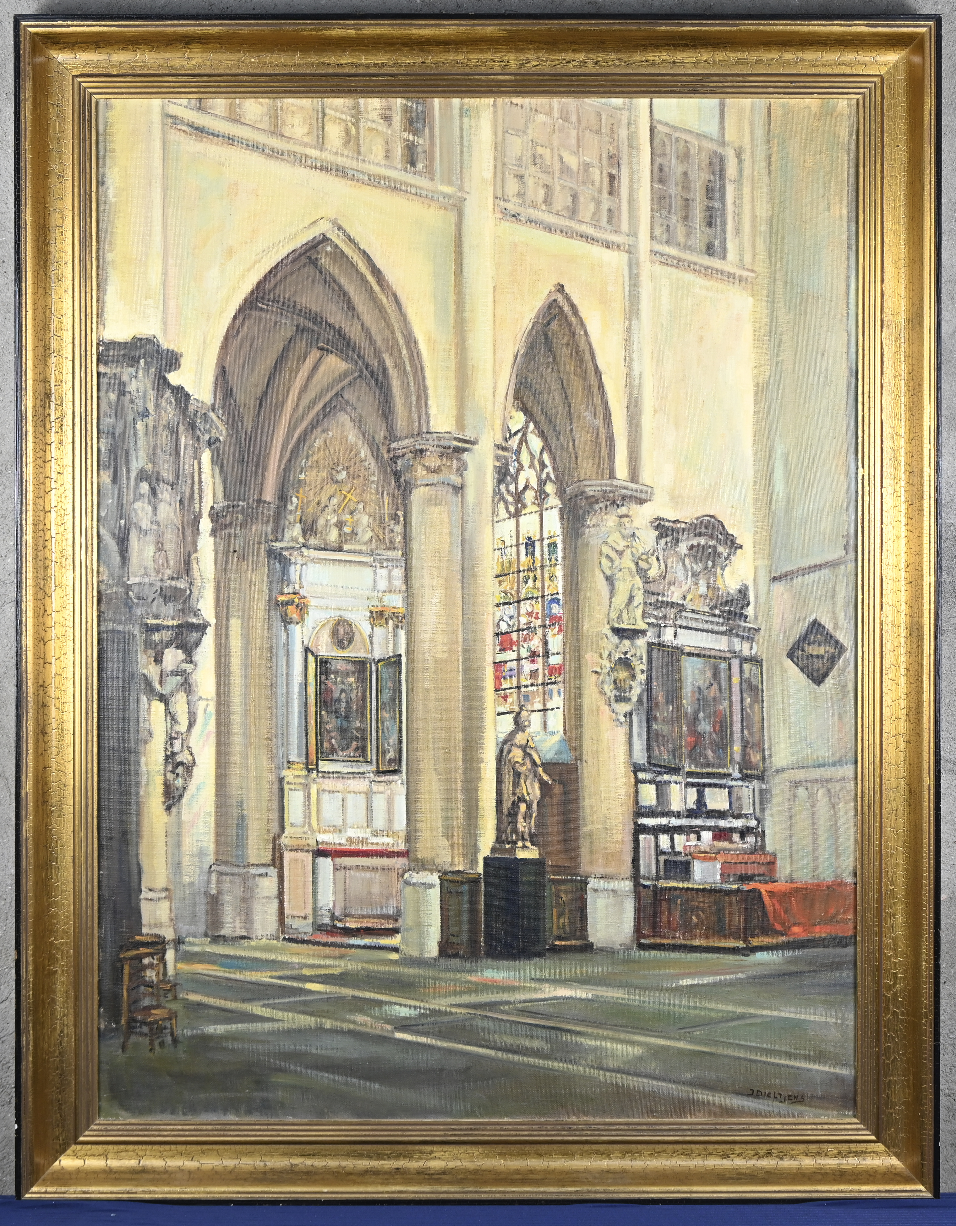 “Interieurzicht”, een schilderij, olieverf op doek, gesigneerd.