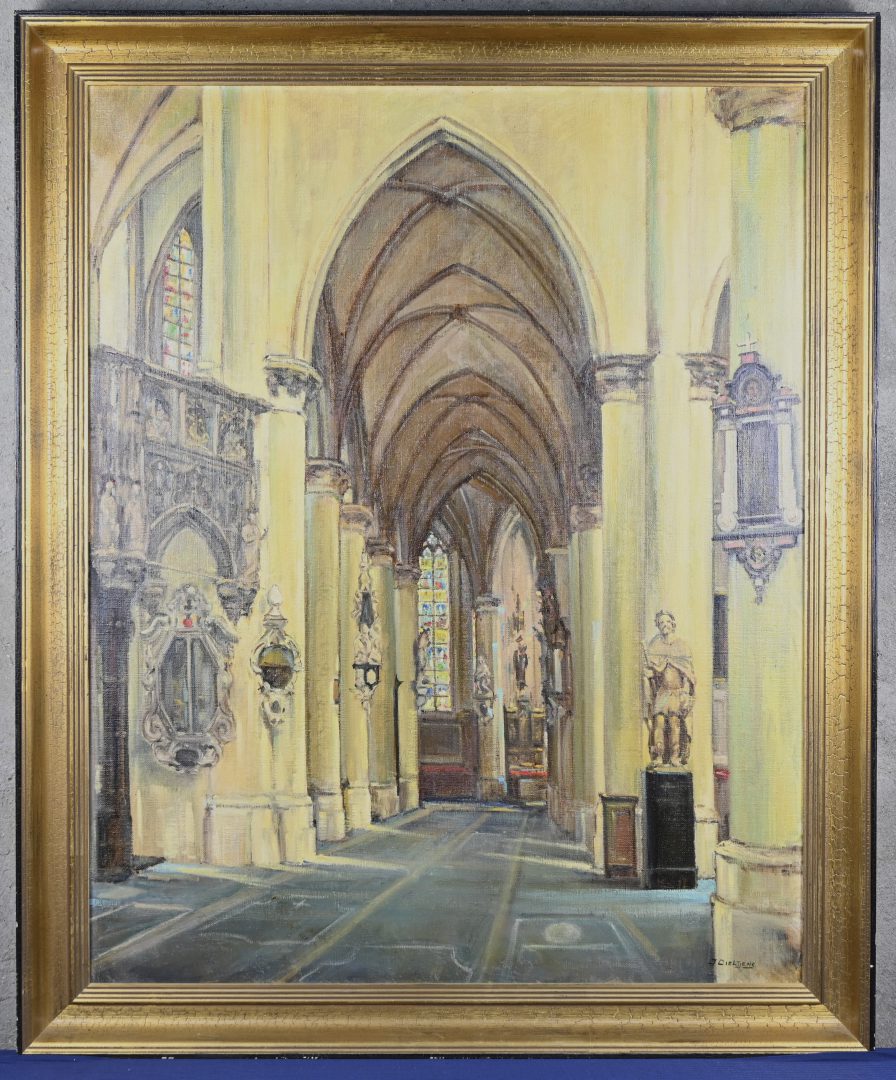 #214‘Interieur met doorkijk’ Olieverf op doek in de stijl van Piet Lippens. Niet getekend.