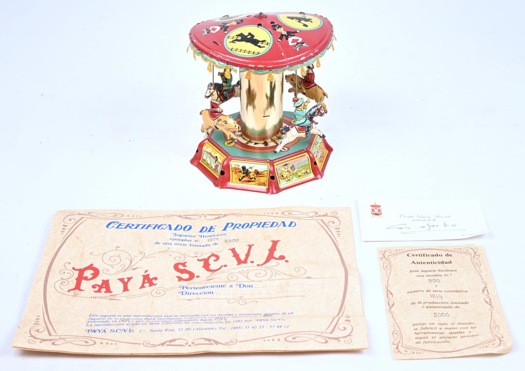 #85Paya juguetes JBI (Alicante-Espana)Period: 1988‘Roeiboot’, opwindbaar blikken speelgoed. Met sleutel en certificaat, in OVP. Nr 399 uit een oplage van 5000 exemplaren.