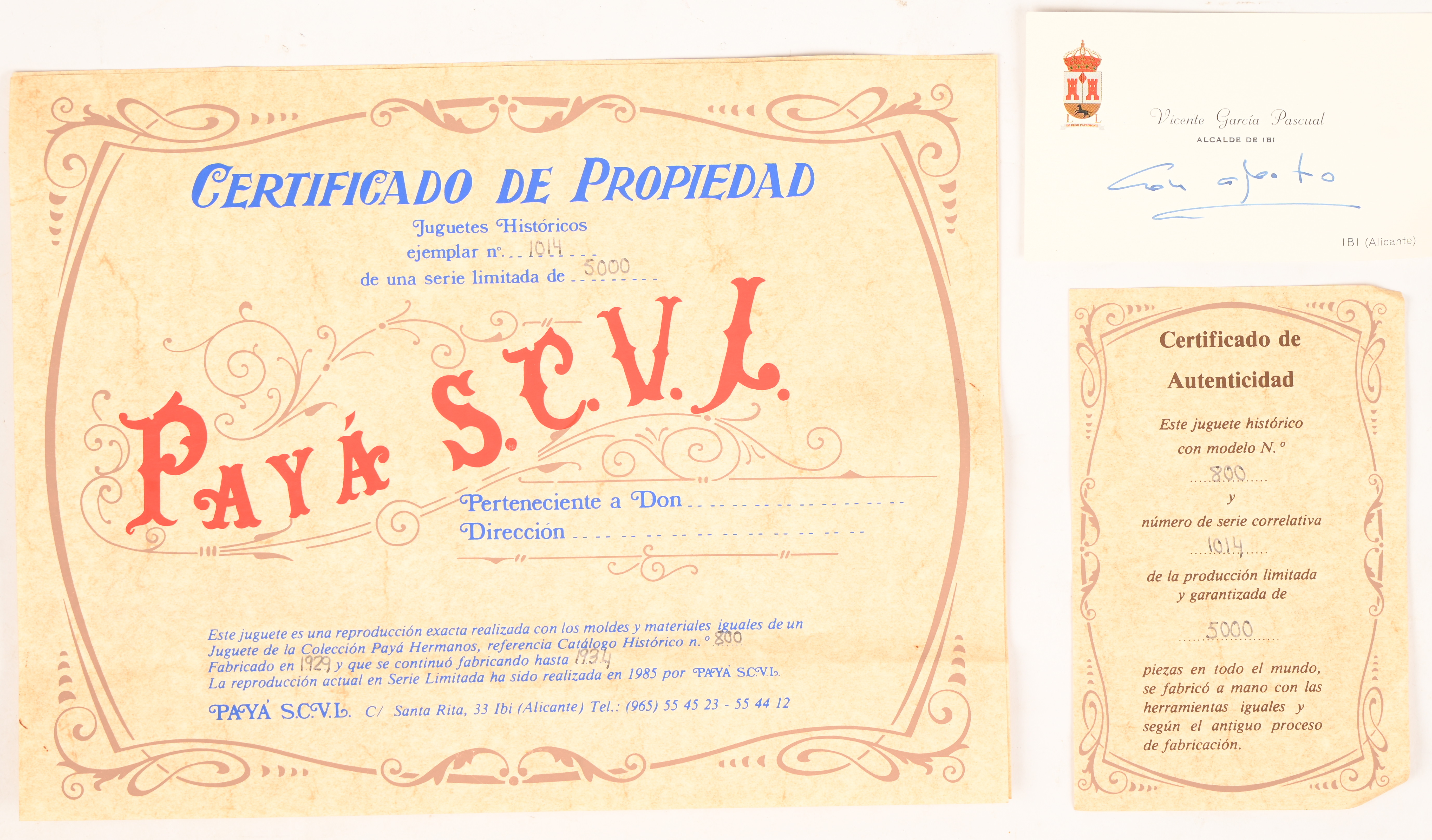 #23Paya juguetes JBI (Alicante-Espana)Period: 1991Een opwindbare blikken wagen met verlichting. Dit stuk is een reproductie van een model uit 1934-42. Nr. 317 uit een oplage van 5000 exemplaren. Met certificaat en OVP.