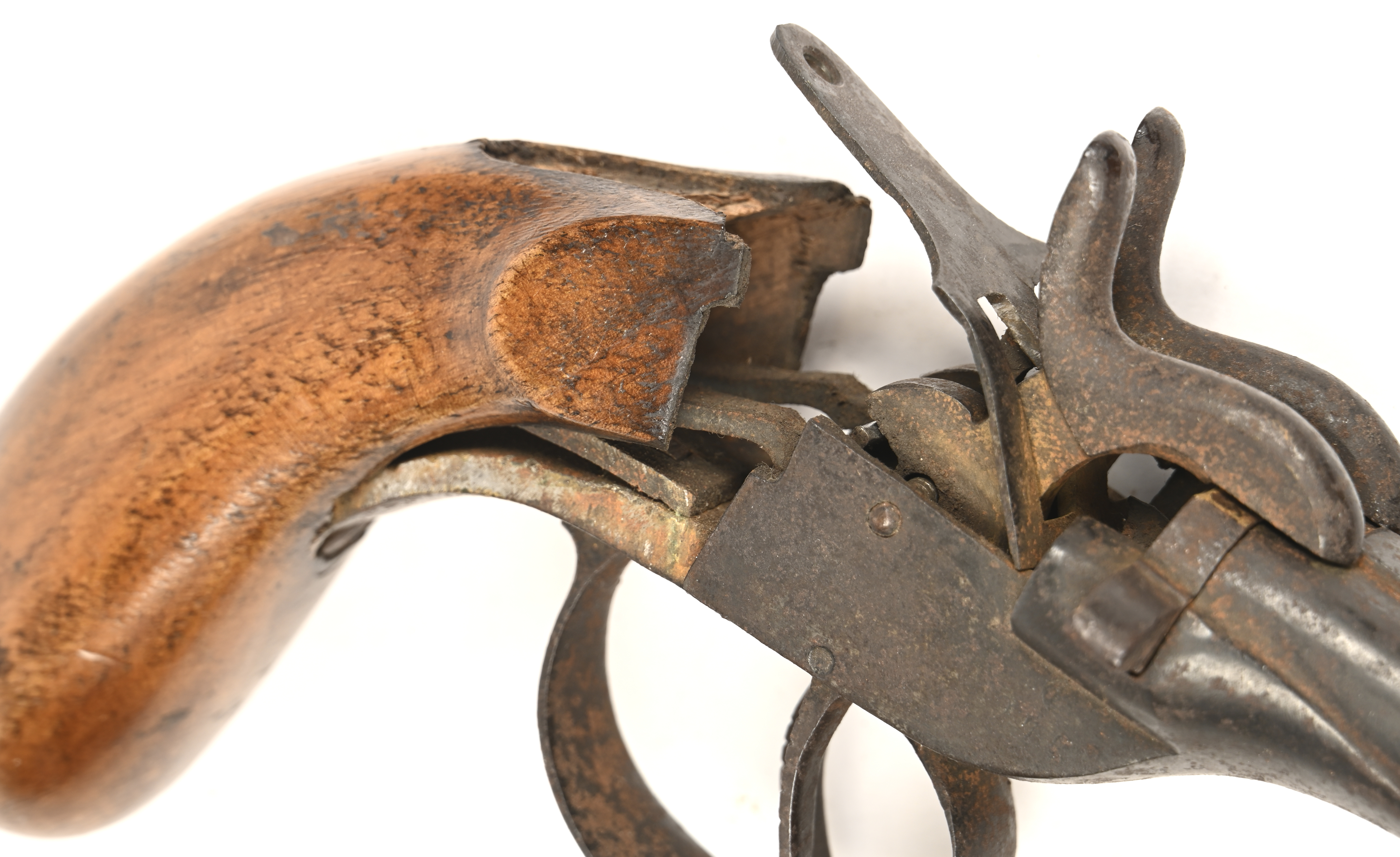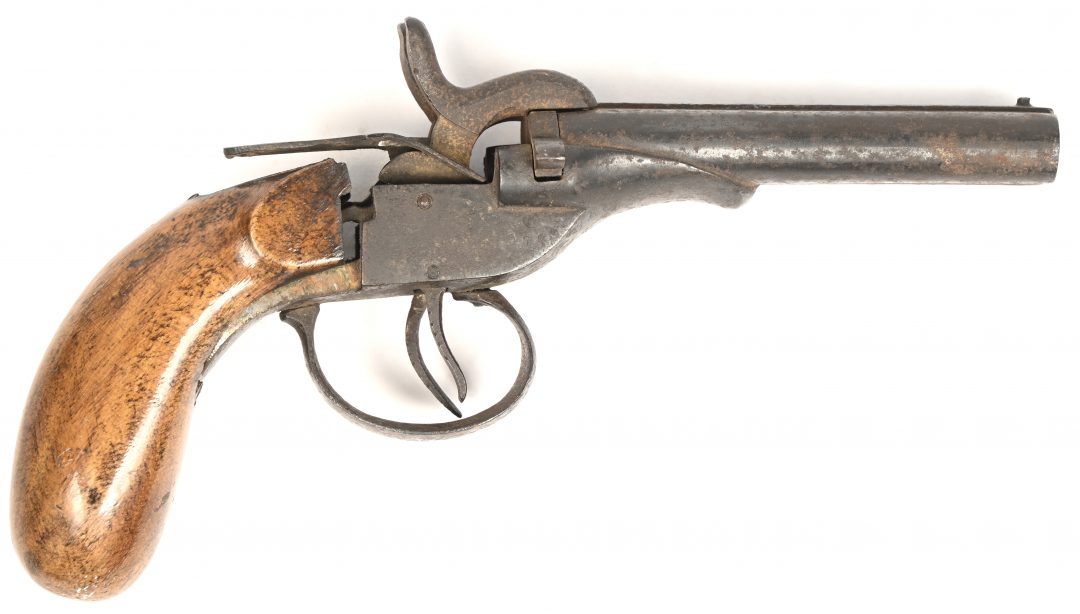 #473Een gebeeldhouwde eikenhouten kapstok versierd met leeuwenkoppen, met vier koperen haakjes, waaraan vier diverse beursvormige tinnen klepkannen. Omstreek 1900.