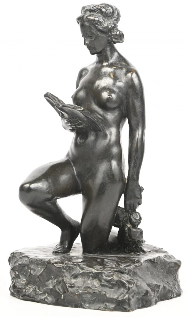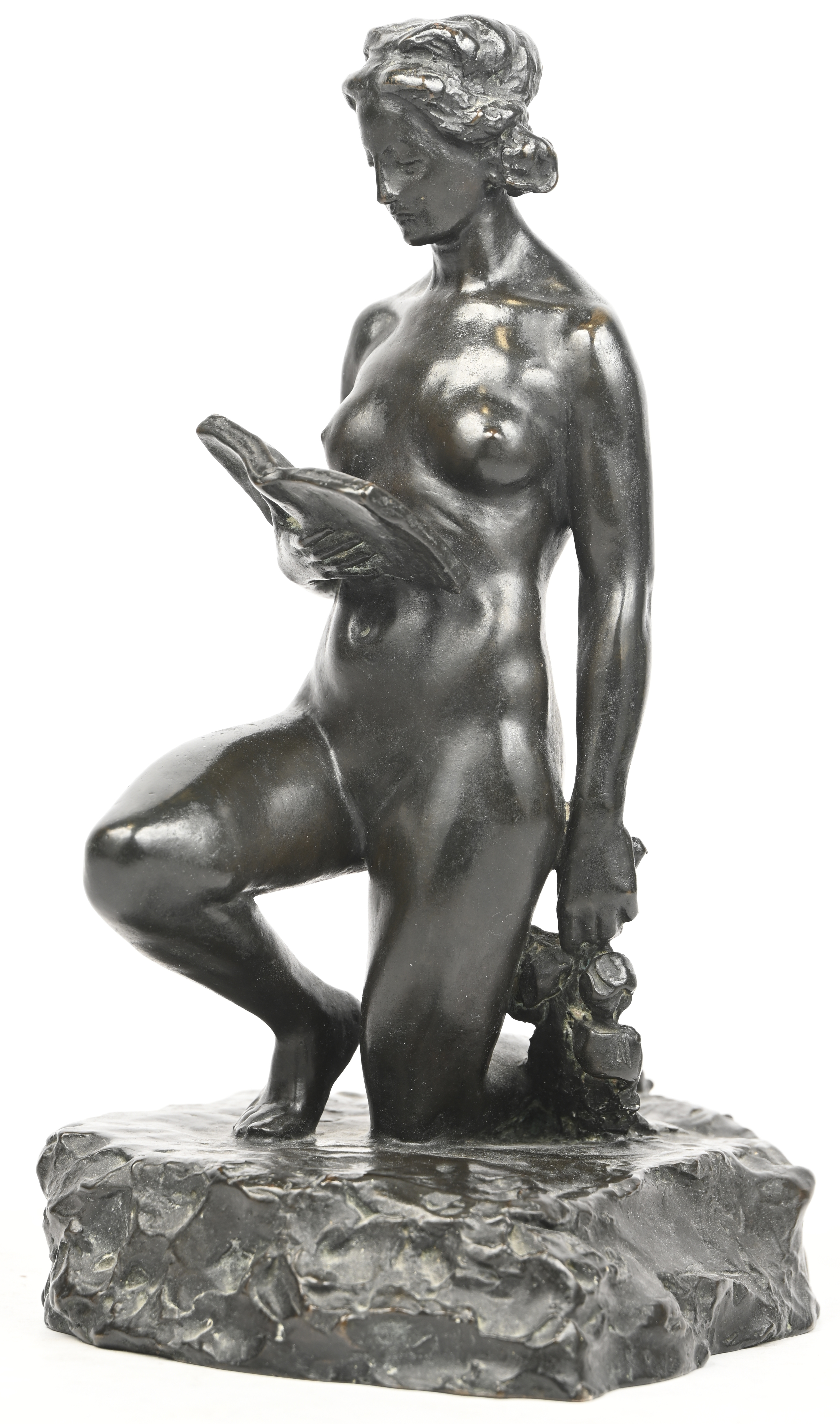 Een bronzen zeemeermin met een grote gouden parel in schelp. Getekend; Zache, Diseno, Spain. Onderstel van een salontafel, blad is manco.