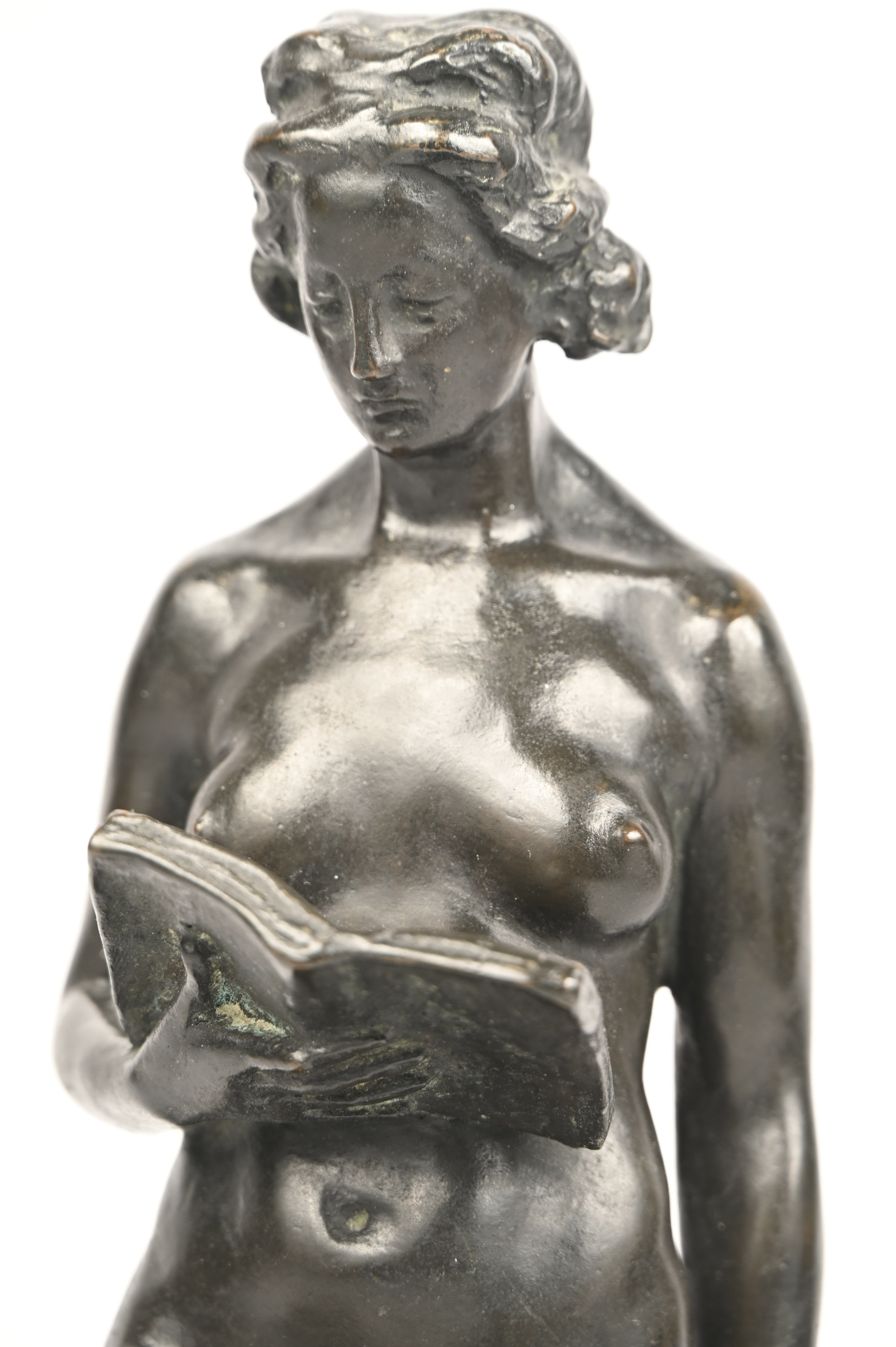 ‘Edeldame met verenhoed’, een buste van gepatinneerd brons. Getekend R. Gregoire.