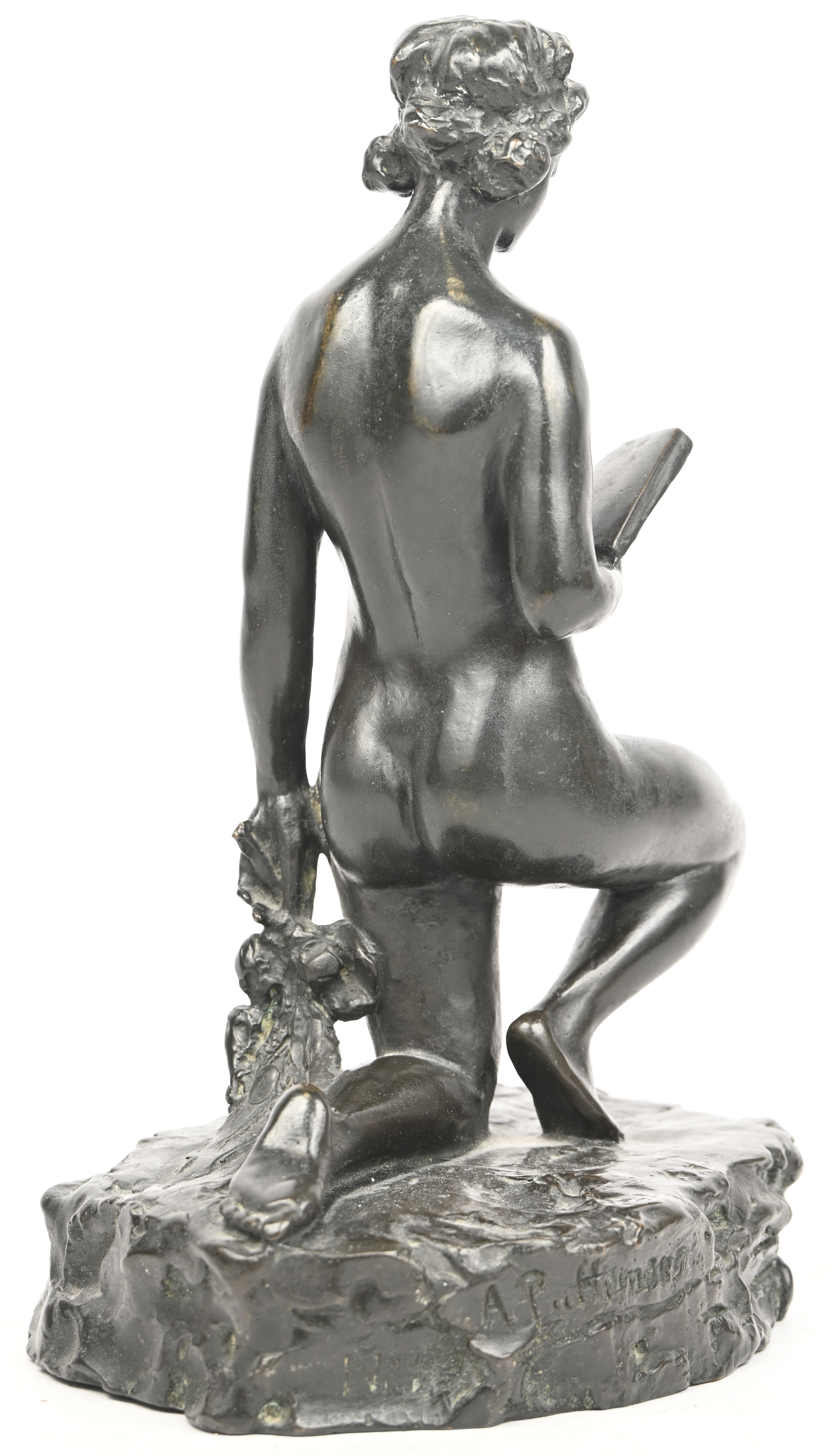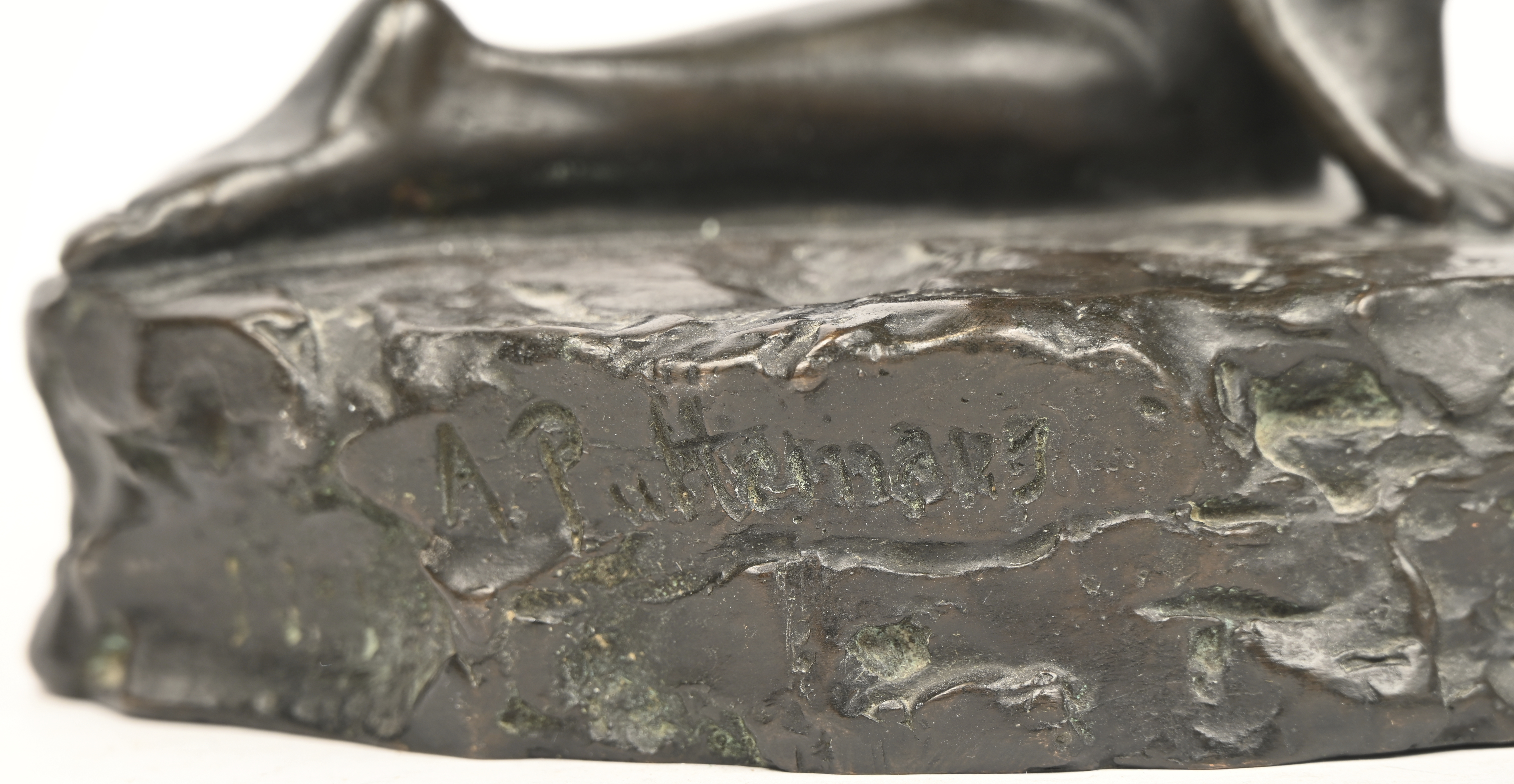 ‘Hoornblazer met jachthonden’, een gepatineerd kunstbronzen beeld op zwarte marmeren voet. Naar A. Moreau.