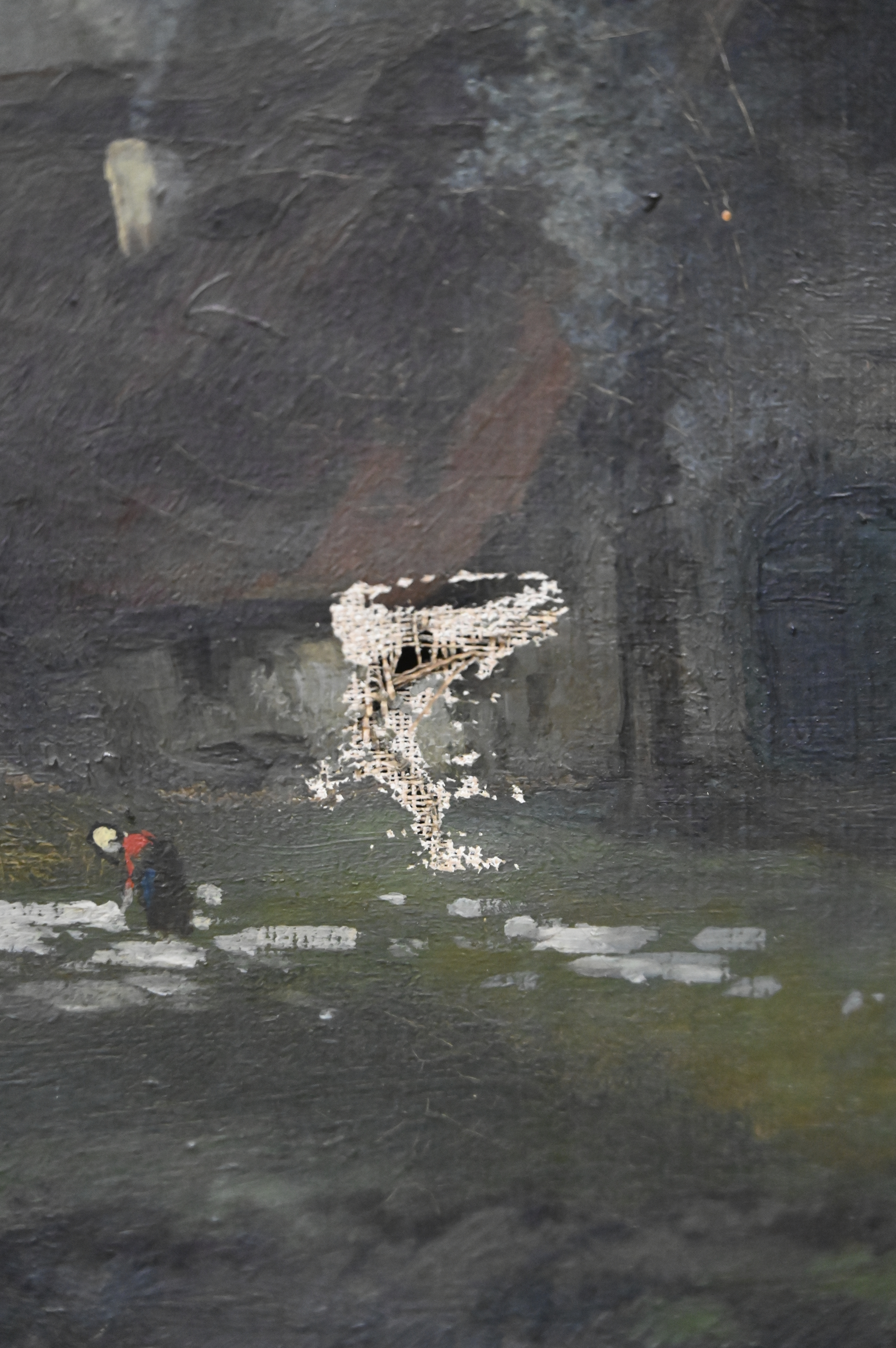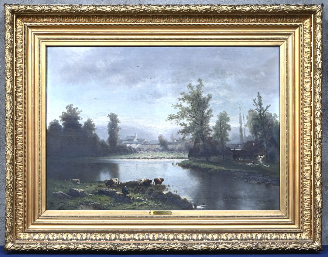 “Koeien aan het water”, een schilderij, olieverf op doek in vergulde kader, gesigneerd. Scheur in het doek. Gedateerd 1877.