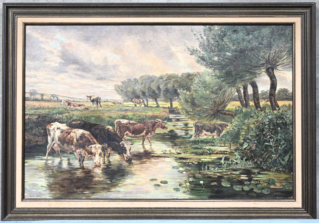 #239‘Landschap met koeien en schapen’, olieverf op doek. Met meerdere scheuren in het doek, niet getekend.