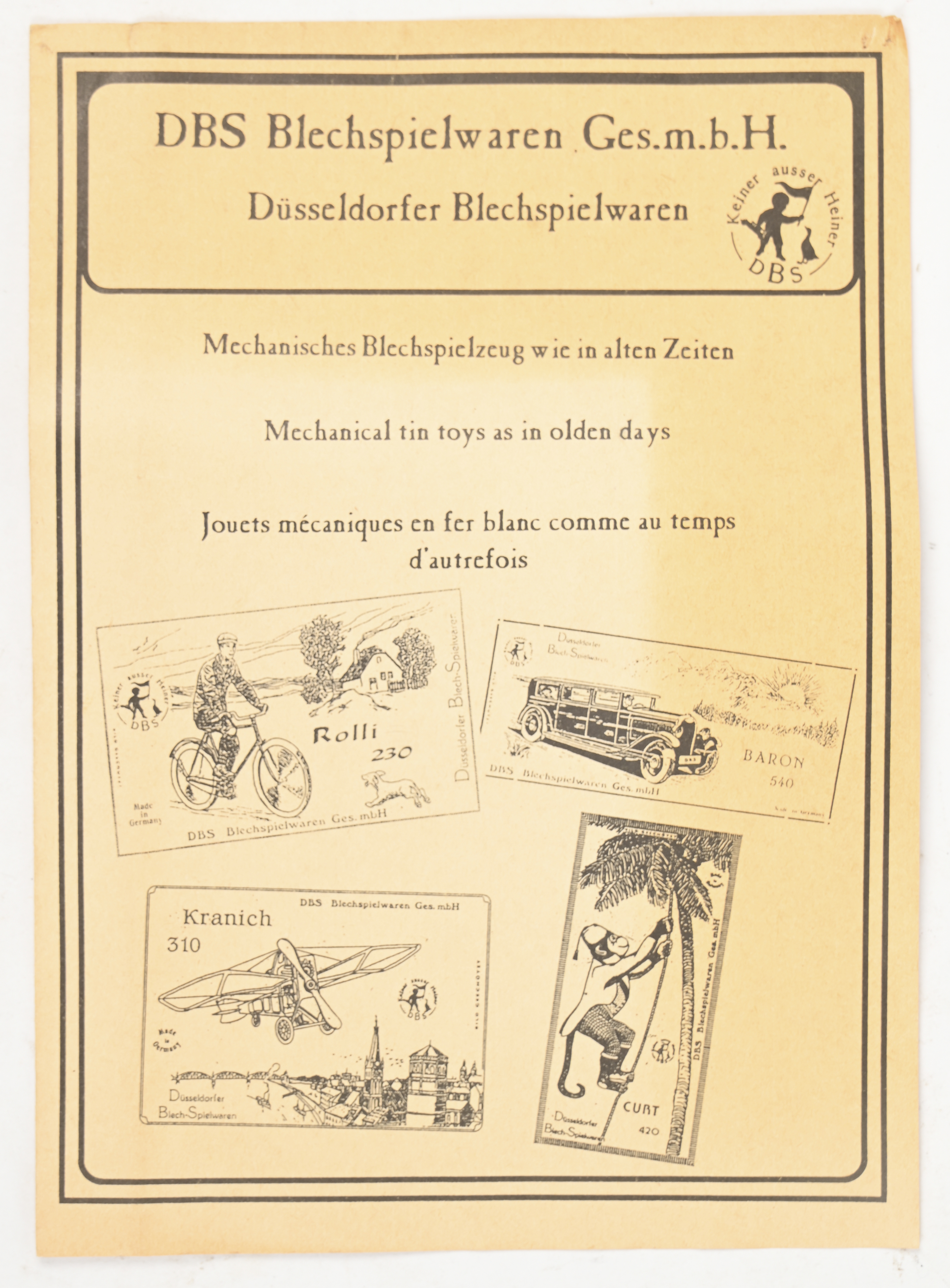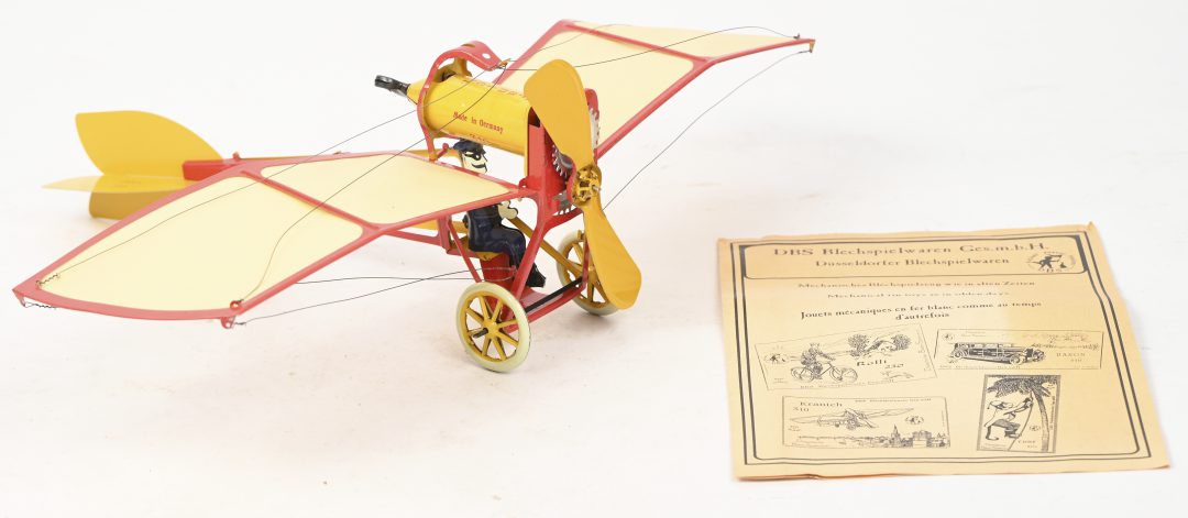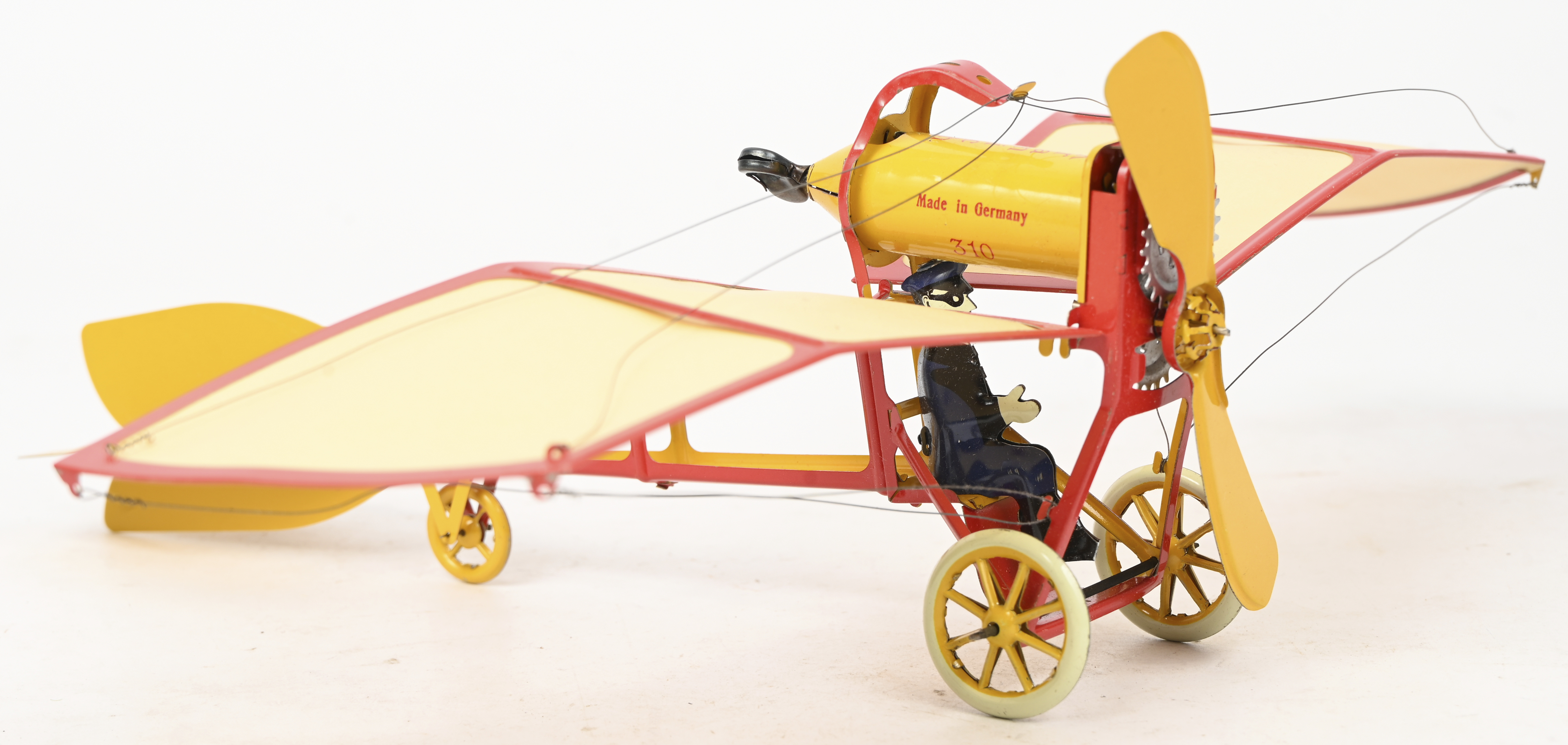 #120Dusseldorfer Blech Spielwaren DBS‘Kranich 310’, een opwindbaar vliegtuig. Recente reproductie naar oud model, met OVP.