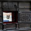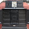 Een gebeeldhouwde eikenhouten kapstok versierd met leeuwenkoppen, met vijf koperen haakjes, waaraan vijf diverse koperen waterketels en koffiepotten. Omstreek 1900.