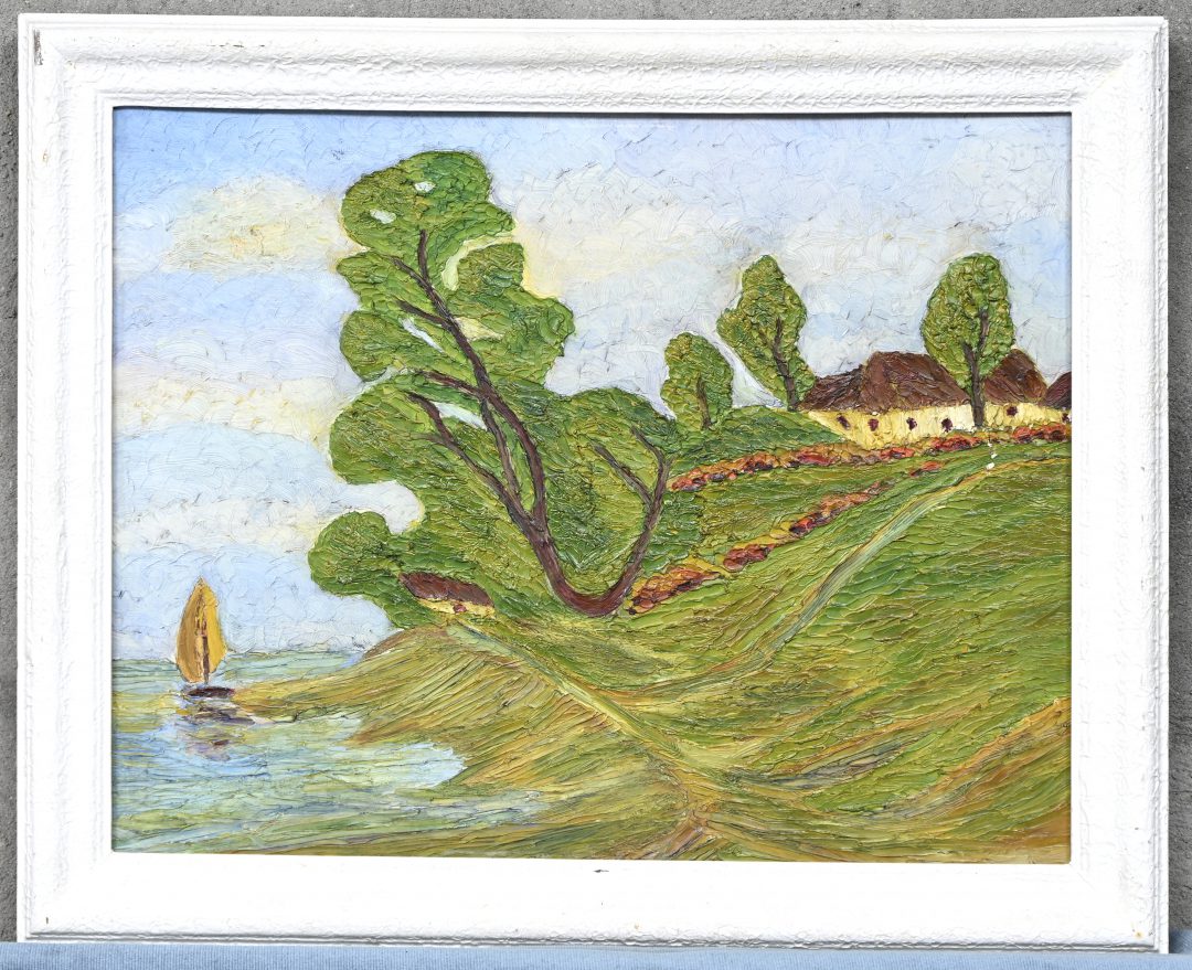 #188‘Dansende vrouwen met hutten in de achtergrond’, een schilderij in gemengde techniek. Getekend Kilhembe.