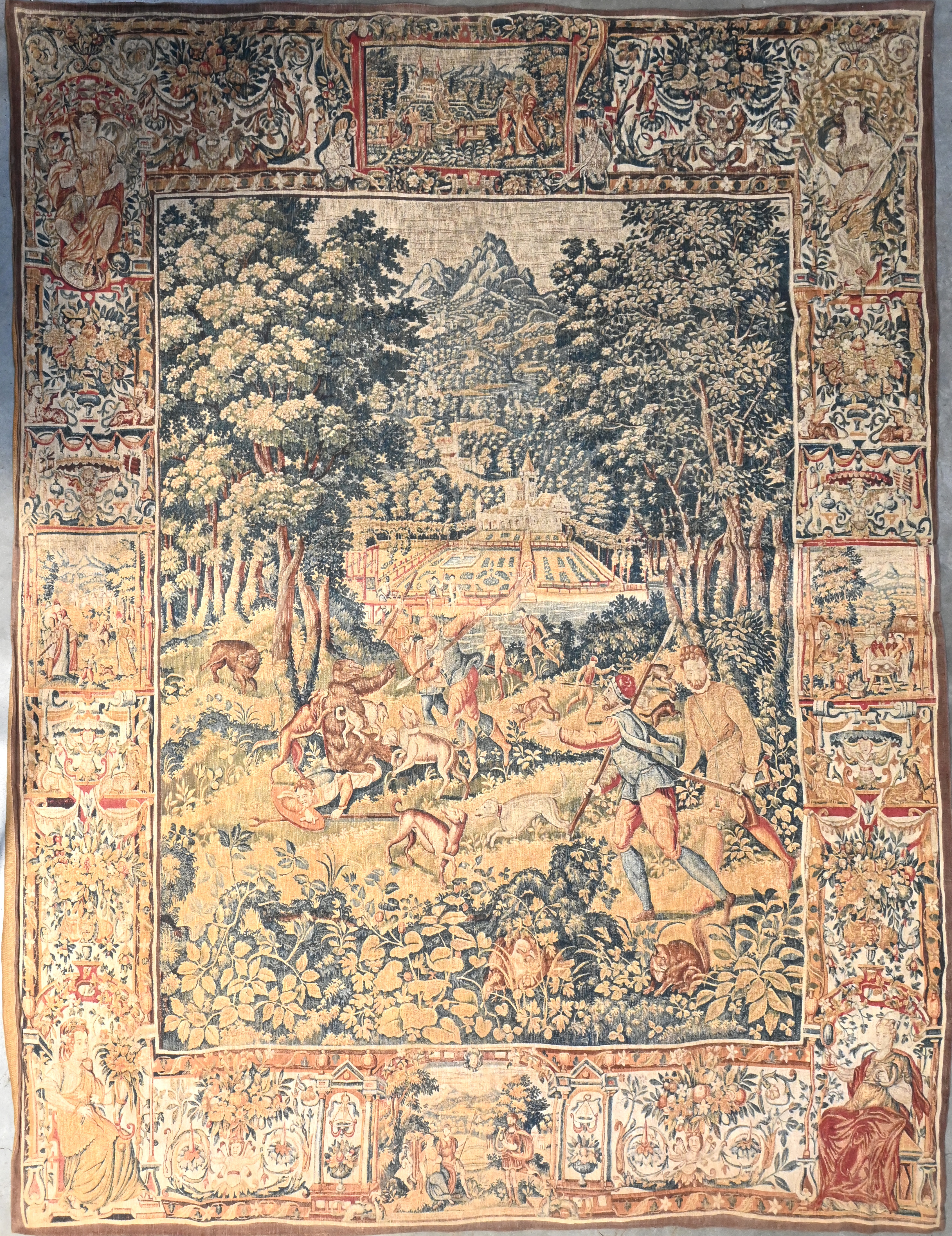 #515Een reproductie van een oud wandtapijt met middeleeuws tafereel.