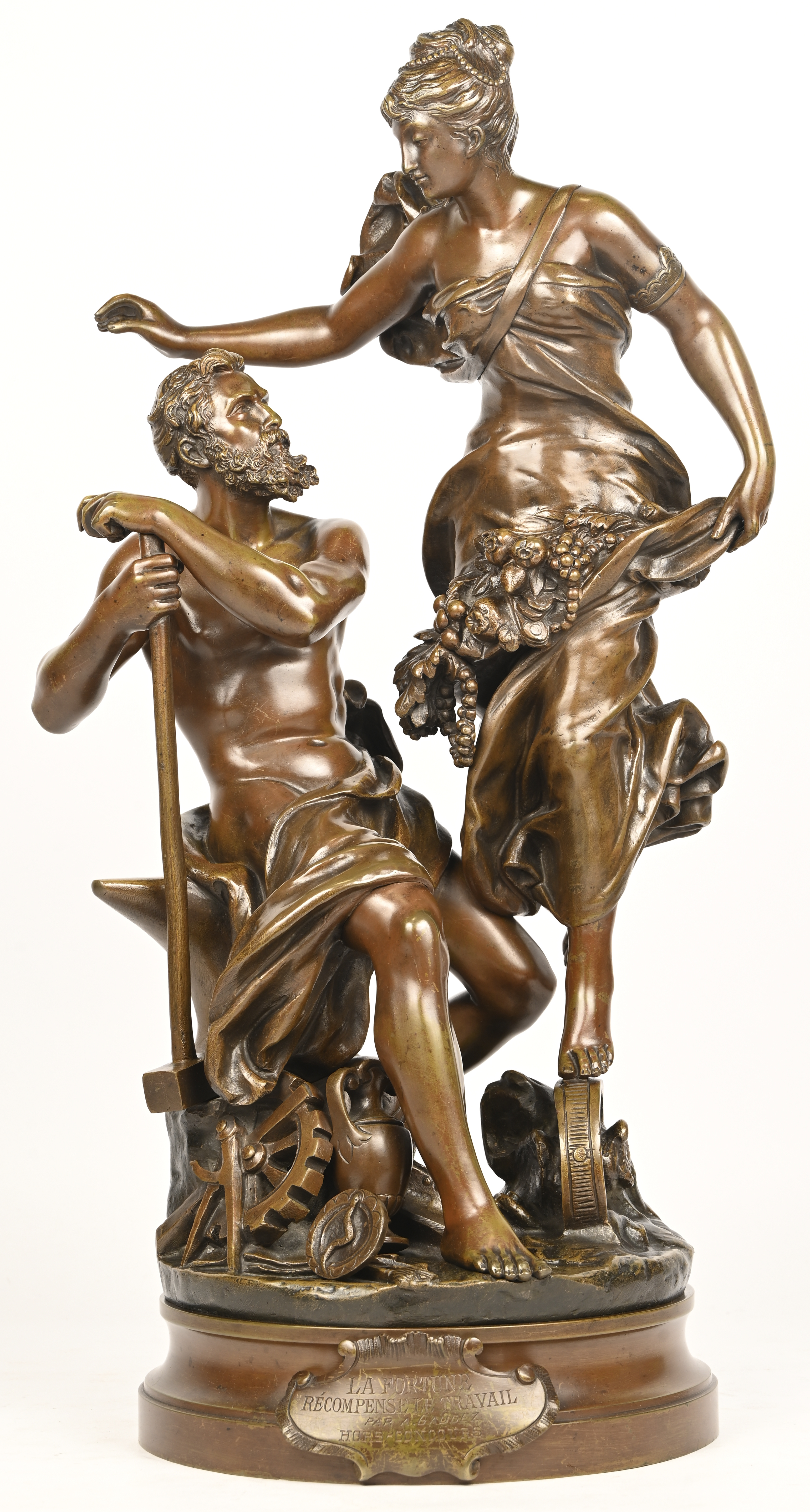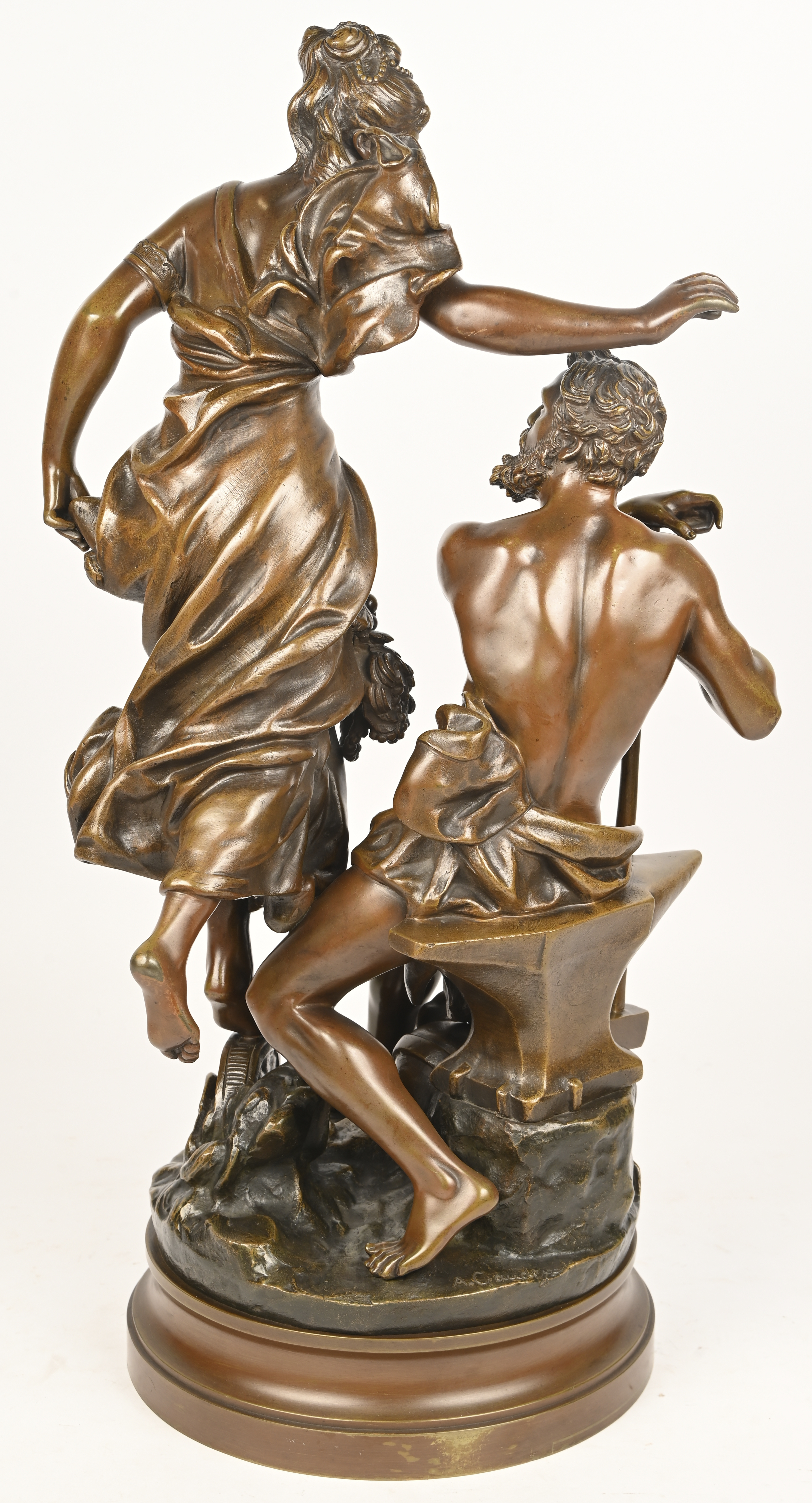 “Aartsengel Michaël verslaat de draak”, een verguld metalen beeld op marmeren sokkel, naar Emmanuel Frémiet. Het zwaard met punt manco. Draagt handtekening.