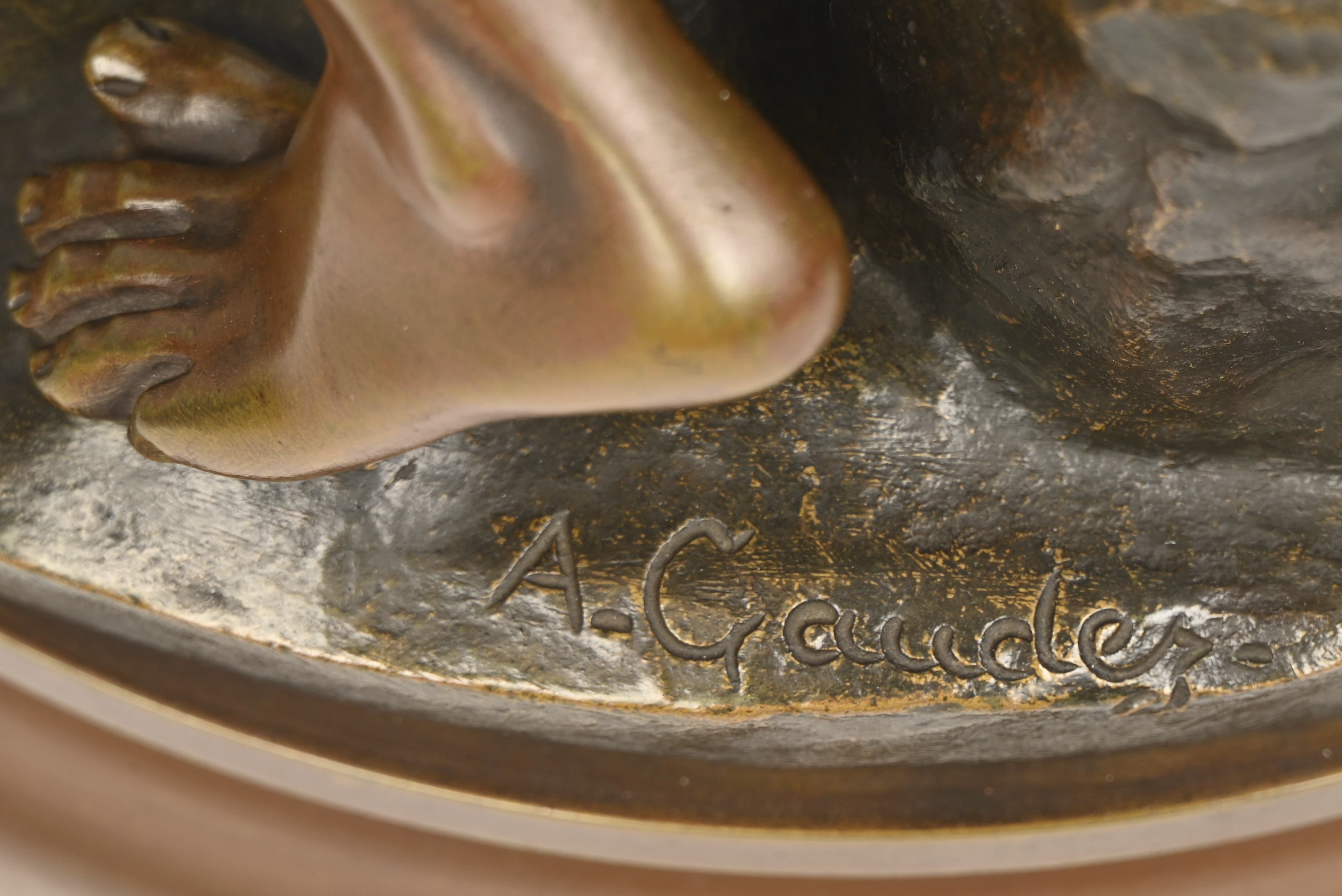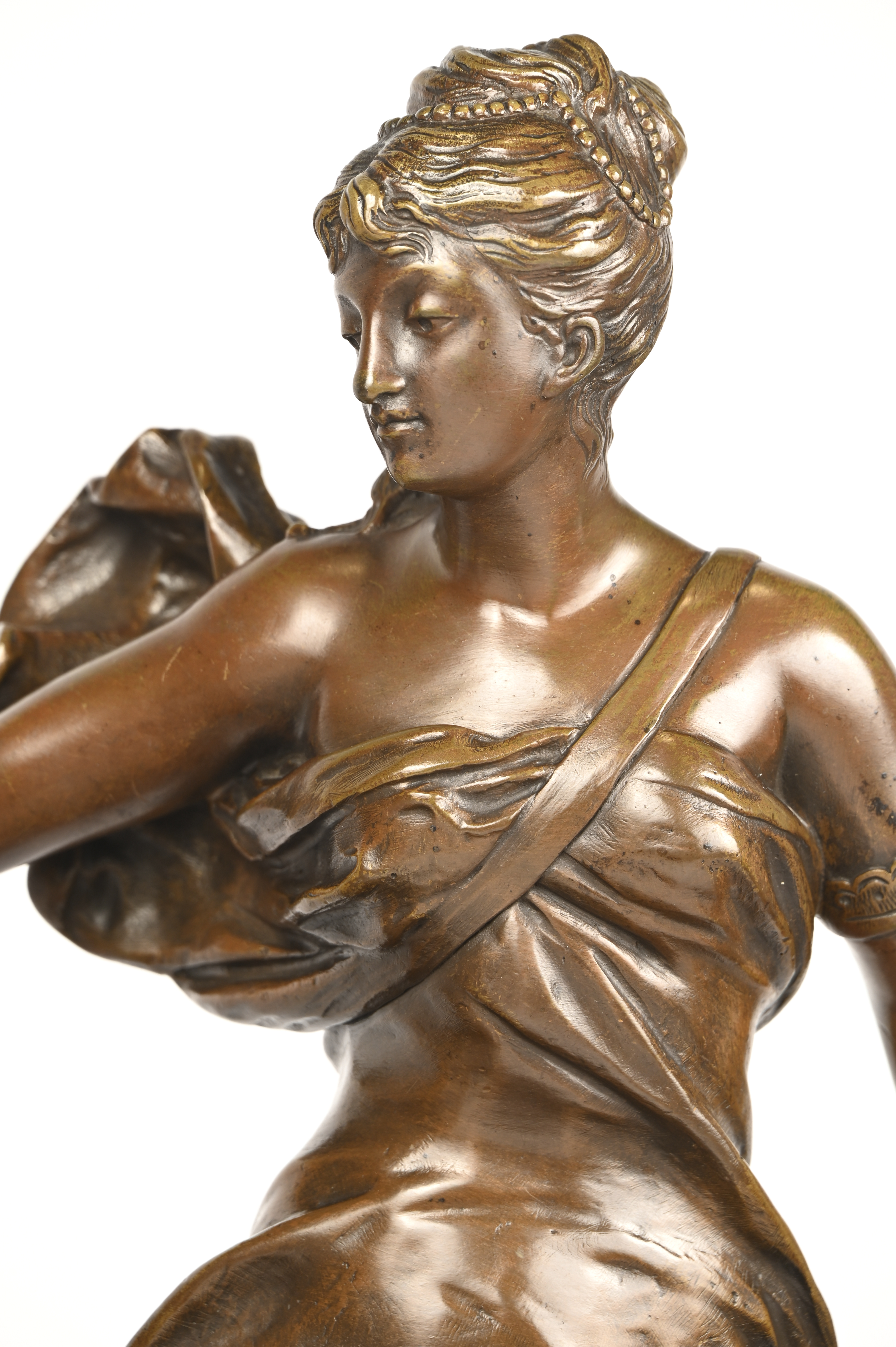 “Jonge vrouw met luit”, een bronzen beeld op marmeren sokkel naar Auguste Moreau. Draagt handtekening.