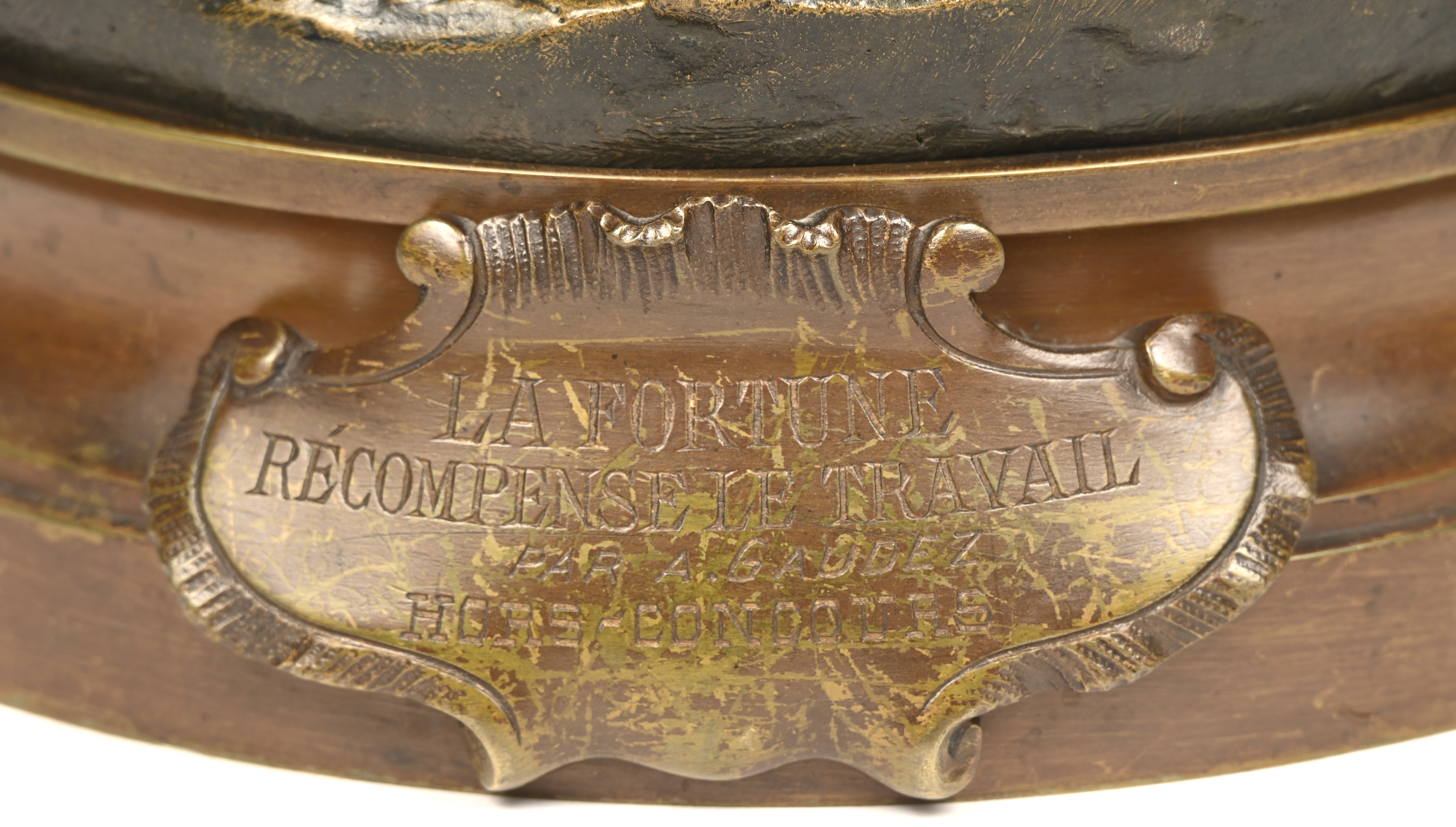"Two putti", a zamak sculpture on a wooden base, bears a signature. -