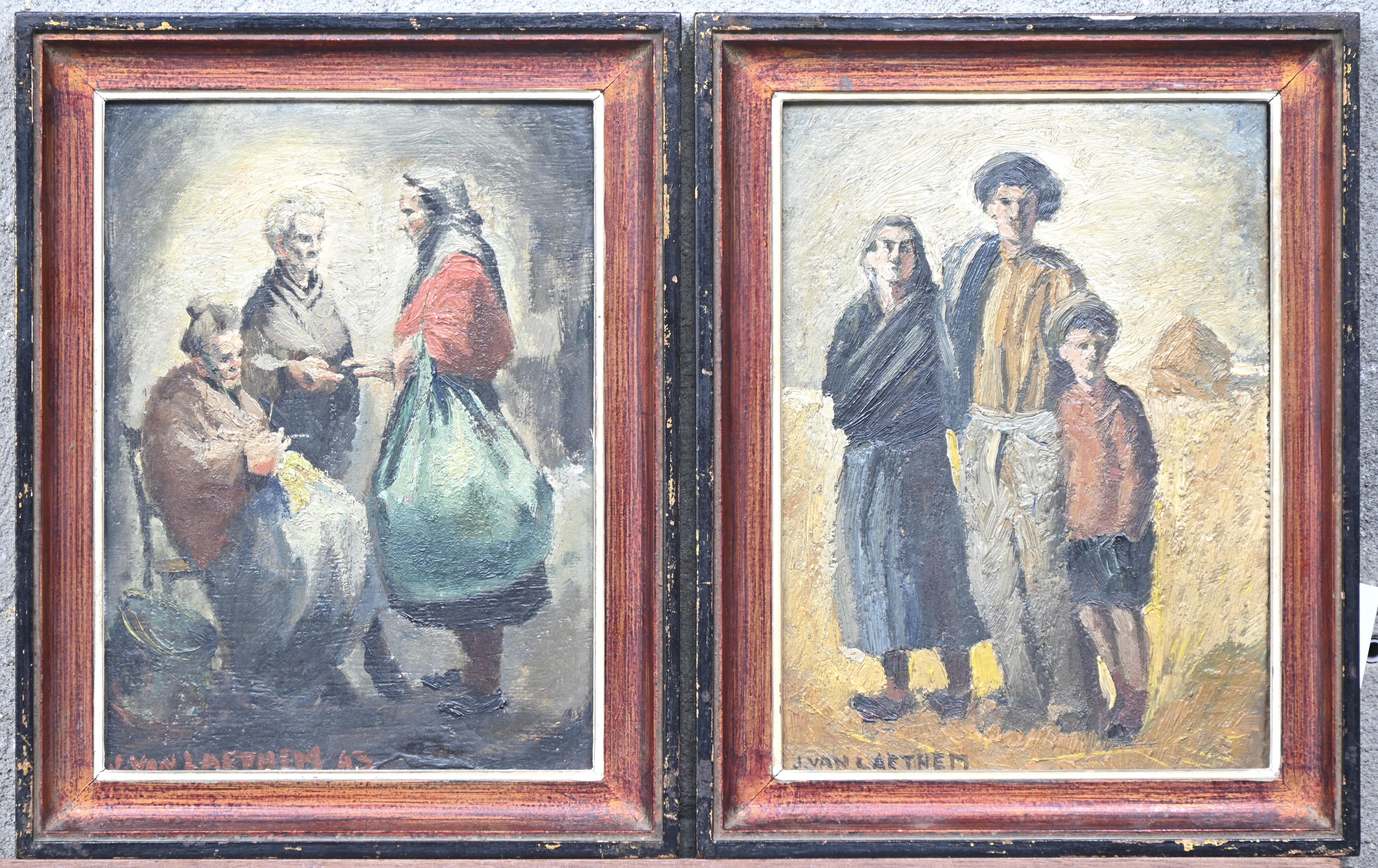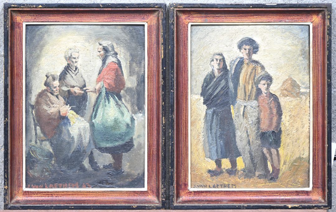 ‘Landbouwersgezin’ en ‘Het Afscheid’. Twee kleine olieverfschilderijen op paneel. Getekend J. Van Laethem.