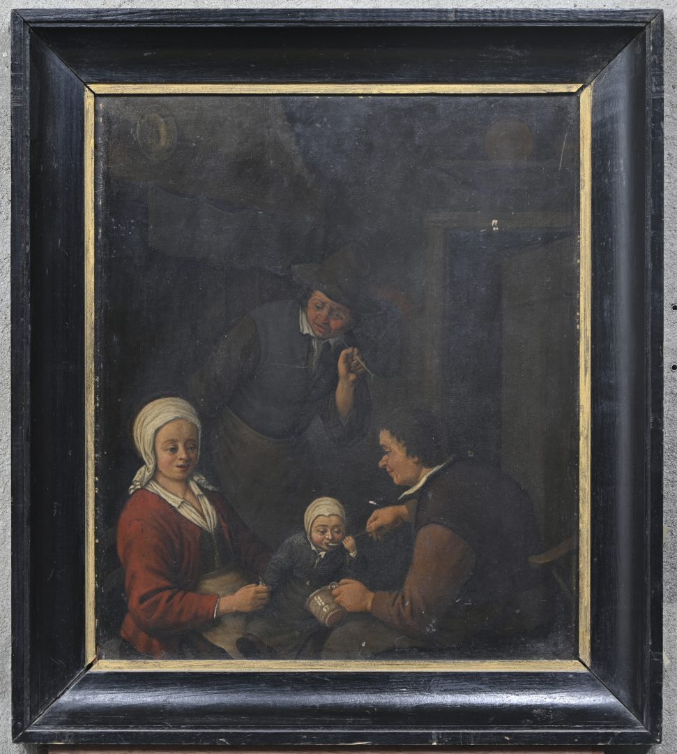 ‘Landelijk interieur met gezin’, olieverf op paneel. Naar het werk van Adriaen Van Ostade.