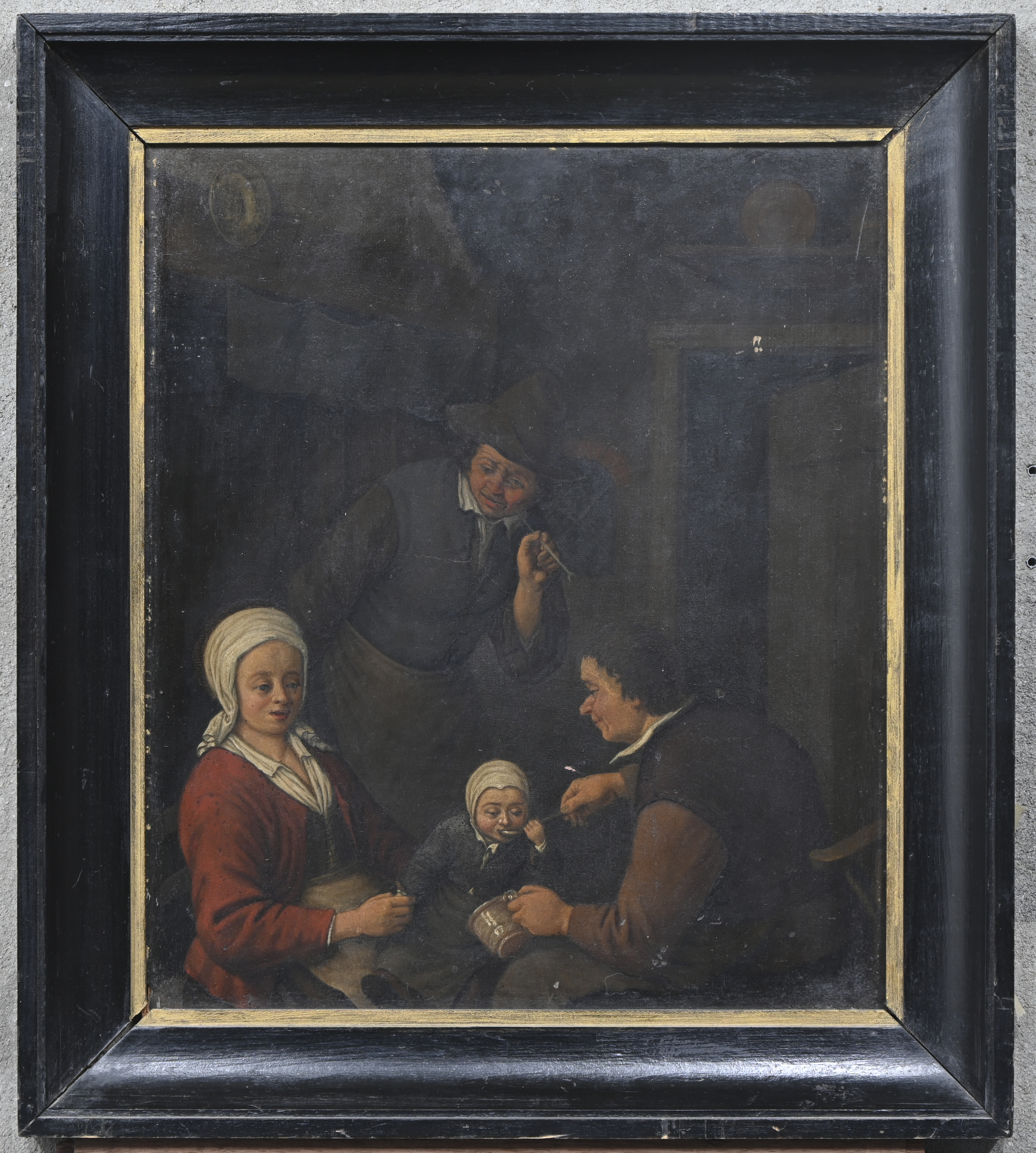 'Rural interior with family', oil on panel. After the work of Adriaen Van Ostade.