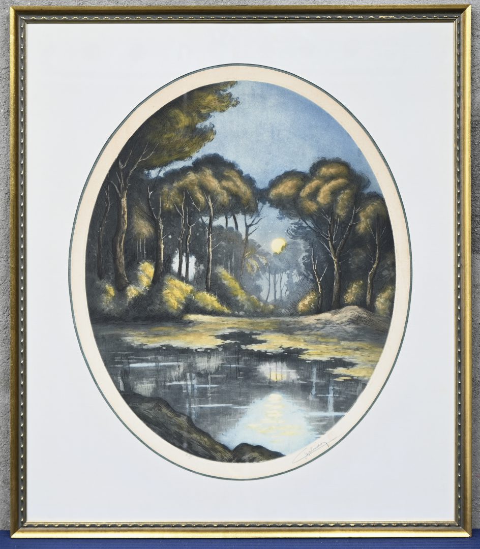 A lot of frames consisting of a color lithograph, a monochrome etching, and a watercolor. Also included is a seascape, oil on cardboard. -