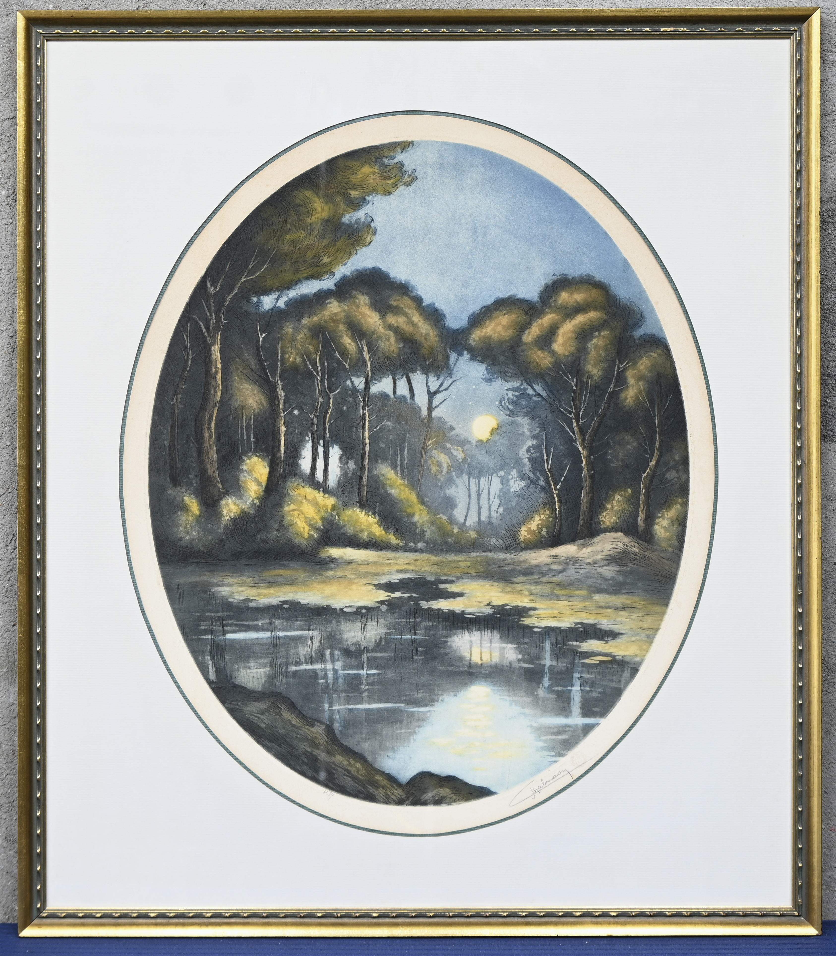 #62Een partij kaders bestaande uit een kleurenlitho, een monochrome ets en een aquarel. Toegevoegd een marine, olieverf op karton.