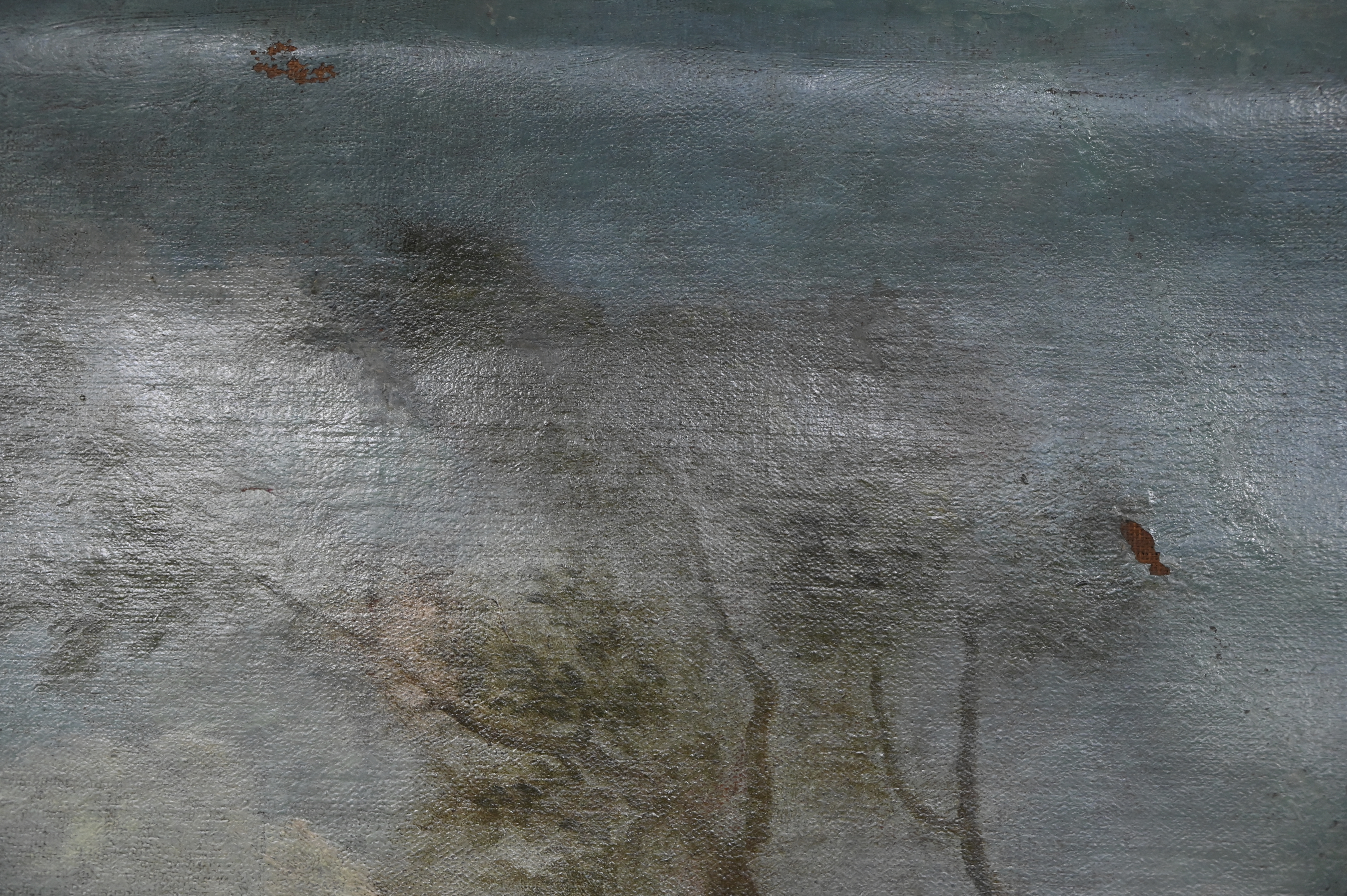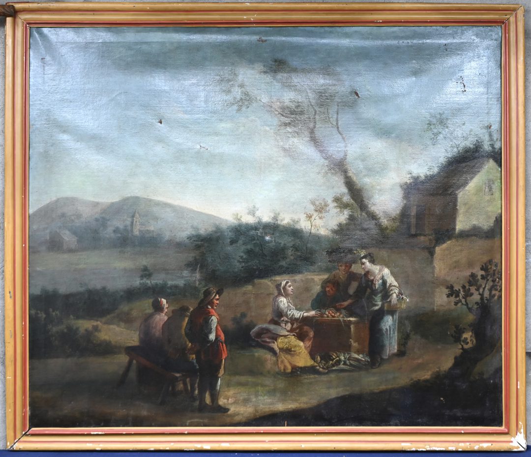 “Landschap met figuren”. Een schilderij, olieverf op doek. Venetiaanse school, eind 18e eeuw. Verweer sporen.
