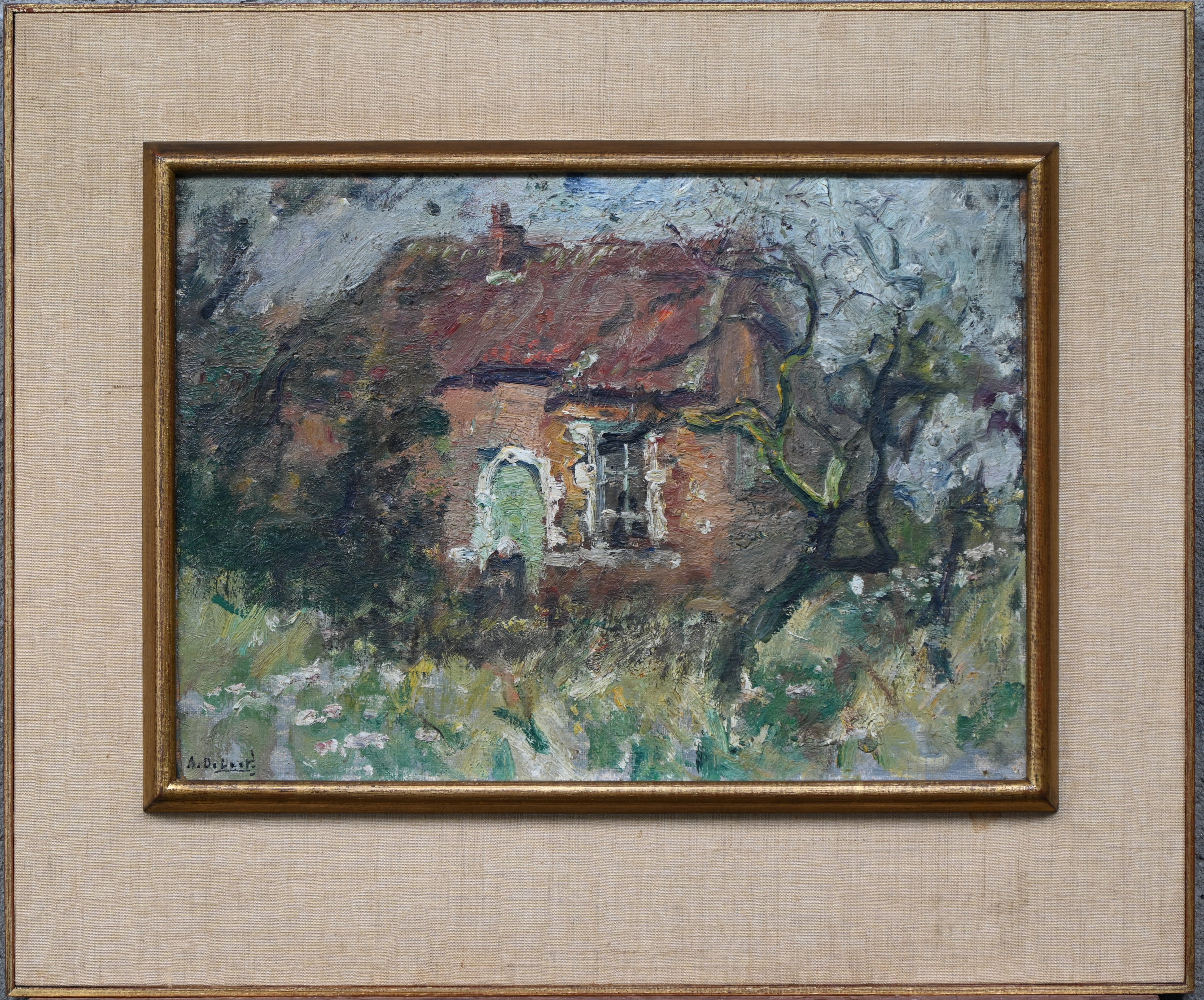 'White farmhouse with crucifix', oil on canvas. Signed; A. P. Duerinckx. With some damage to the paint layer.