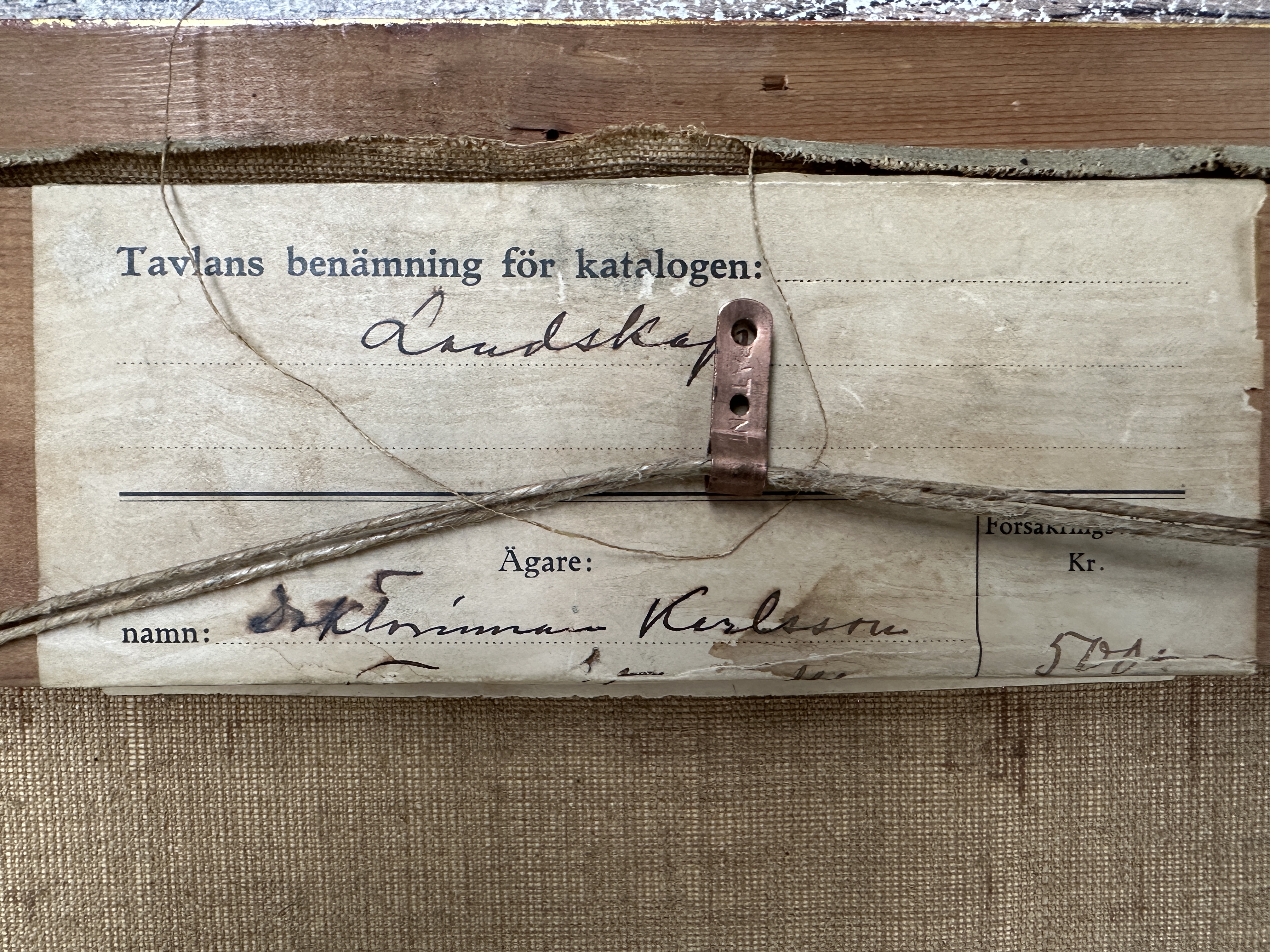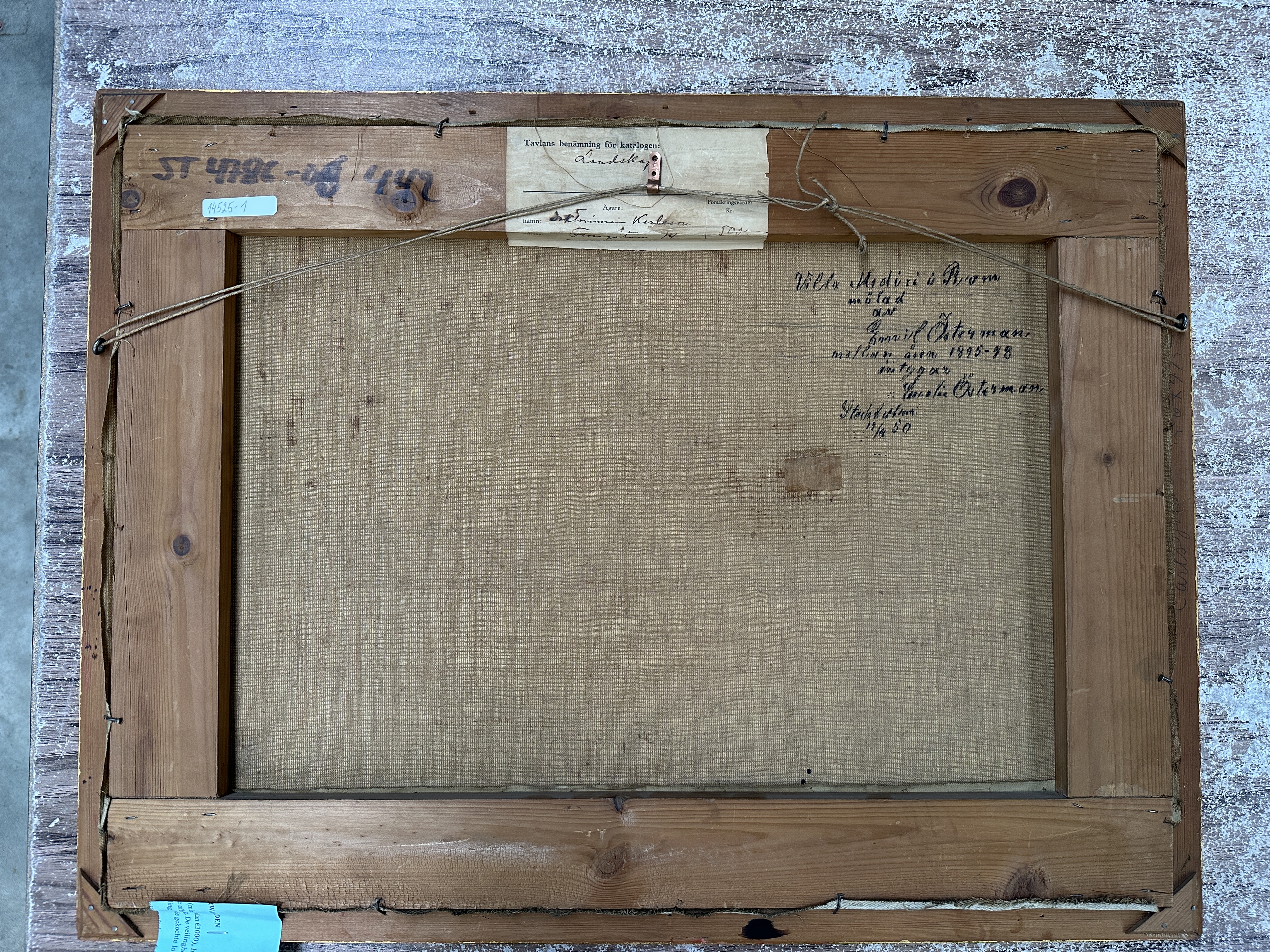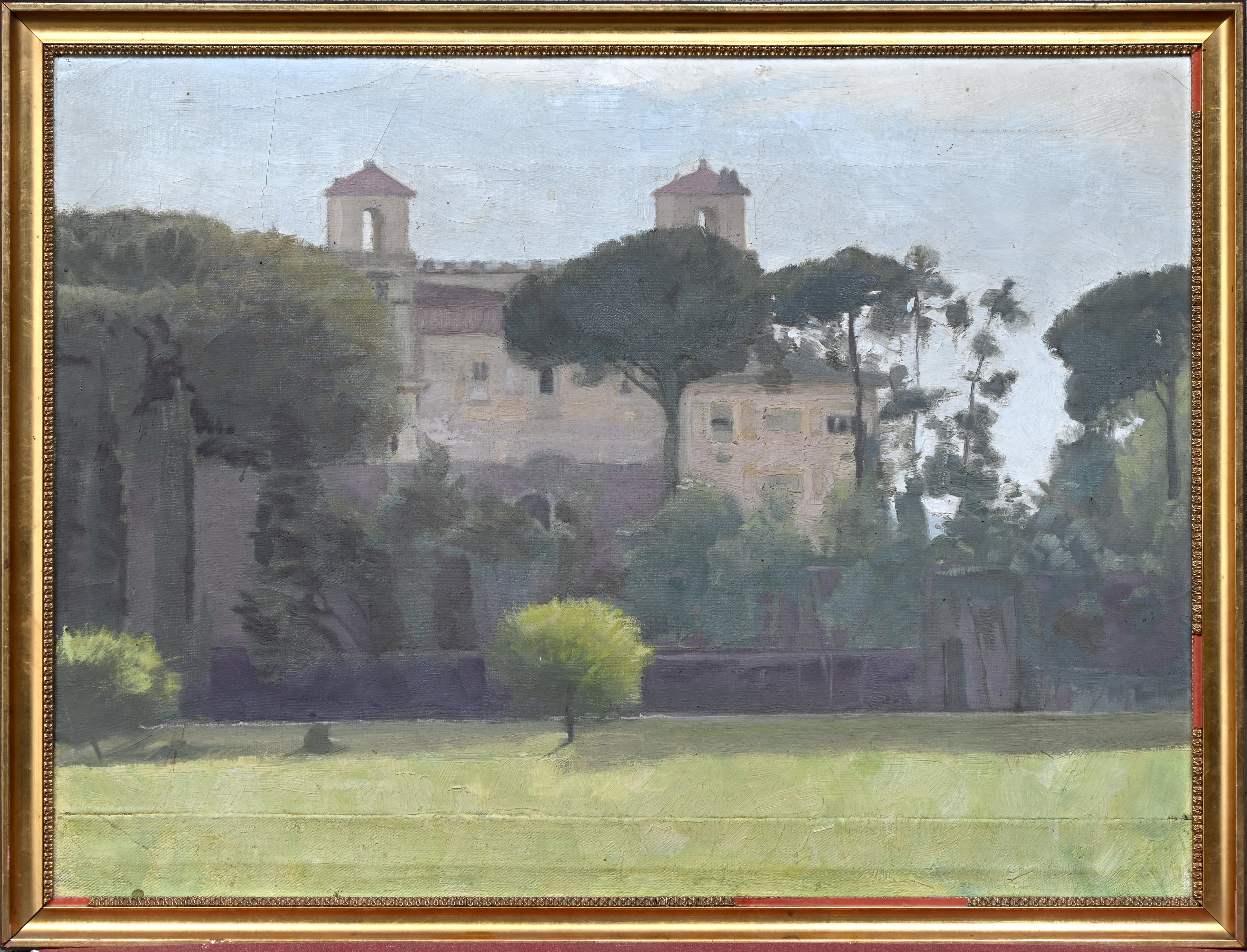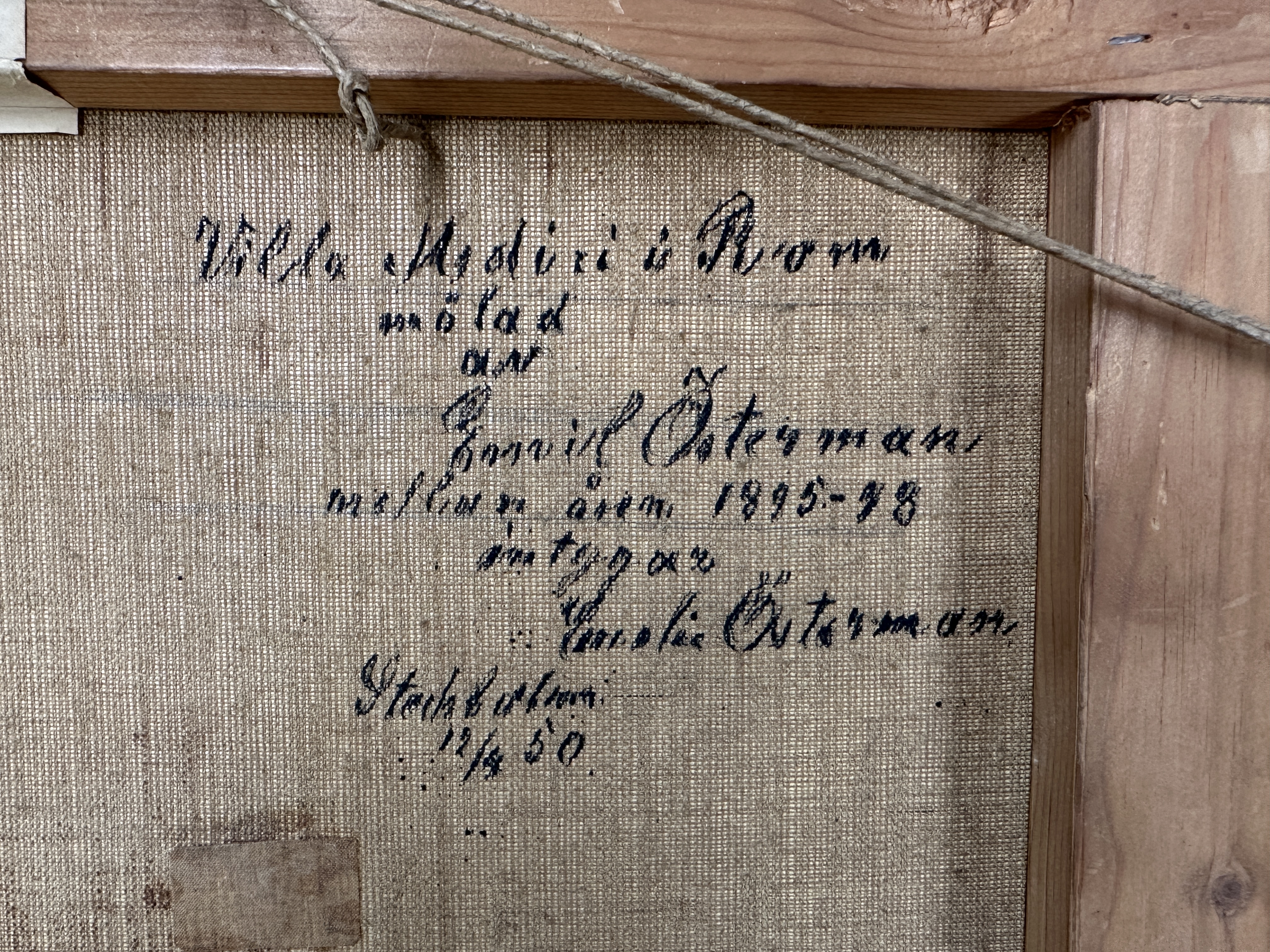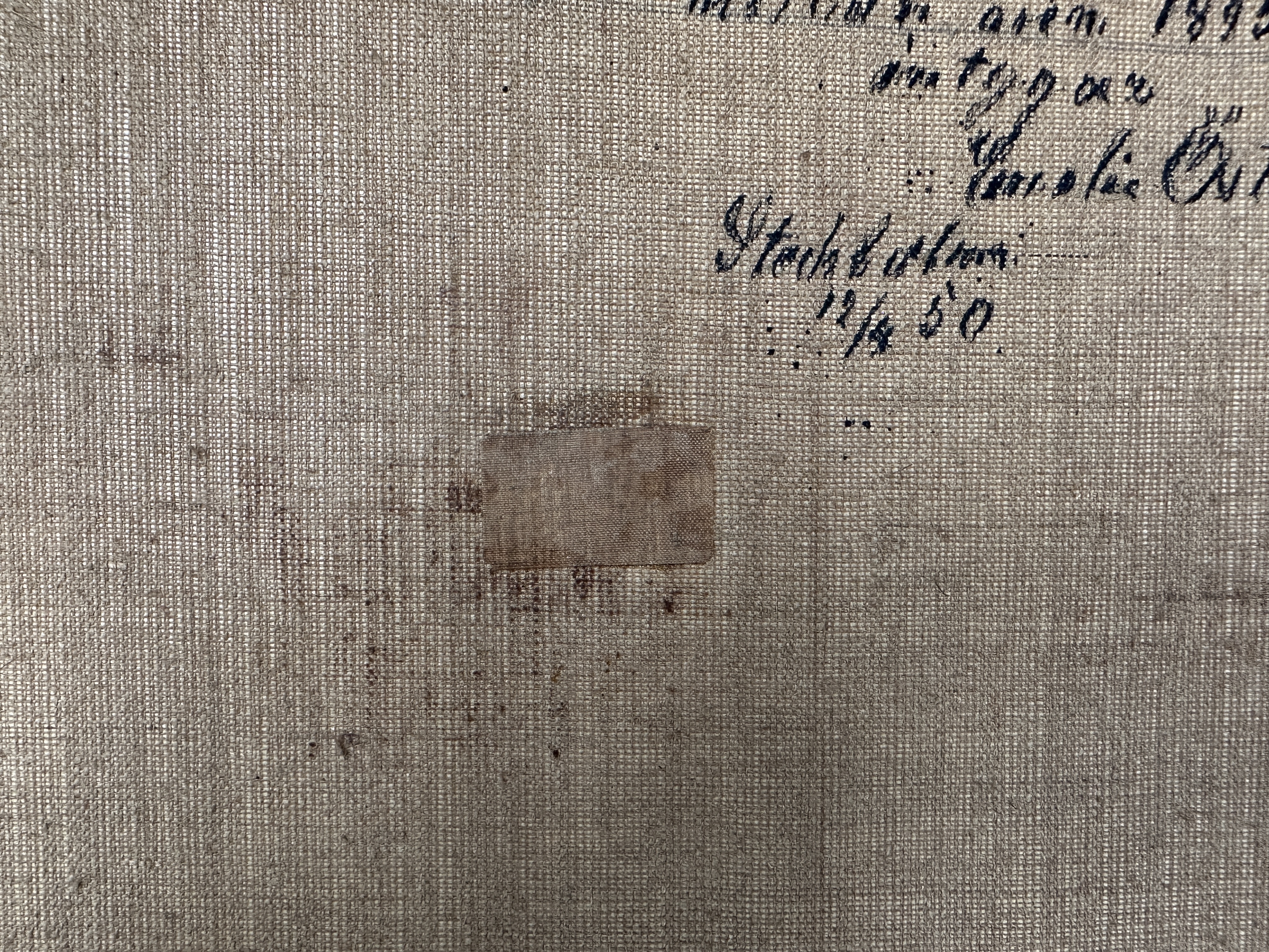 ‘Landschap met kasteel’, een impressionistisch olieverfschilderij op doek. Op de rug een toeschrijving aan Emil Österman.