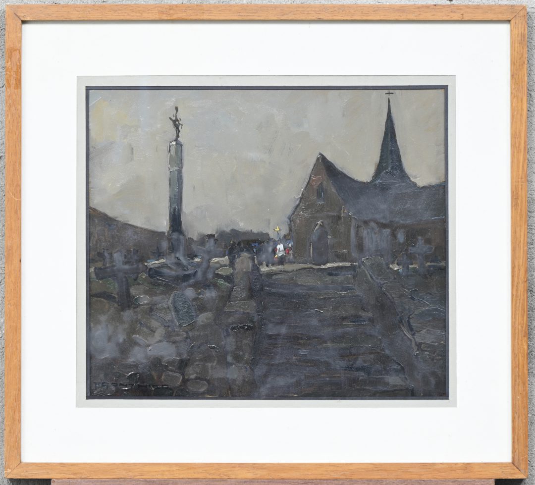 'Landscape with church', a study in oil paint on paper. Signed H. Kuyten. -
