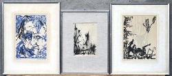 Two linocuts (black with spot color) and an ink drawing by Jan Manten. -