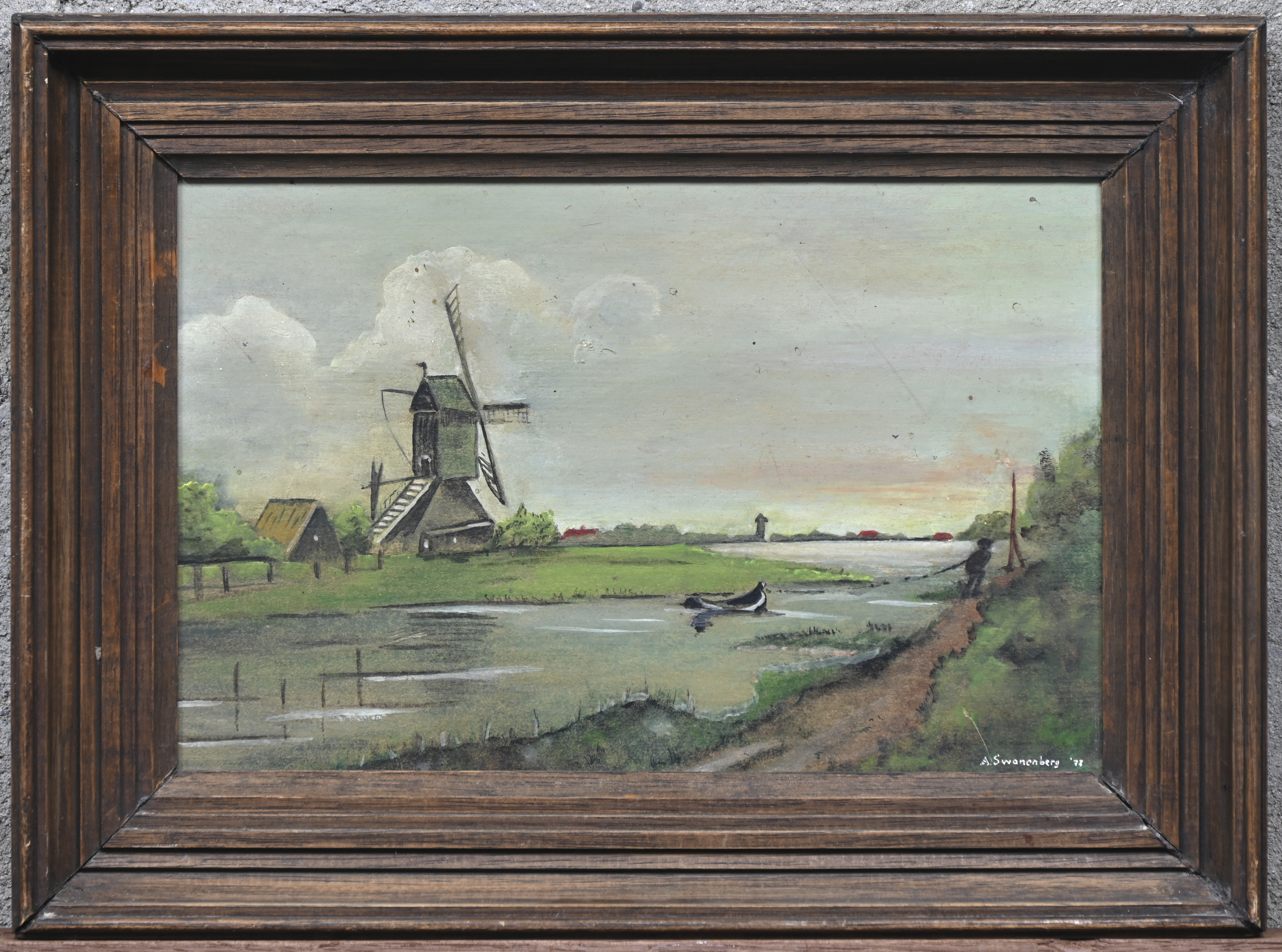 “Landschap met molen”, een schilderij, olieverf op paneel, gesigneerd A. Swanenberg en gedateerd ‘77’.