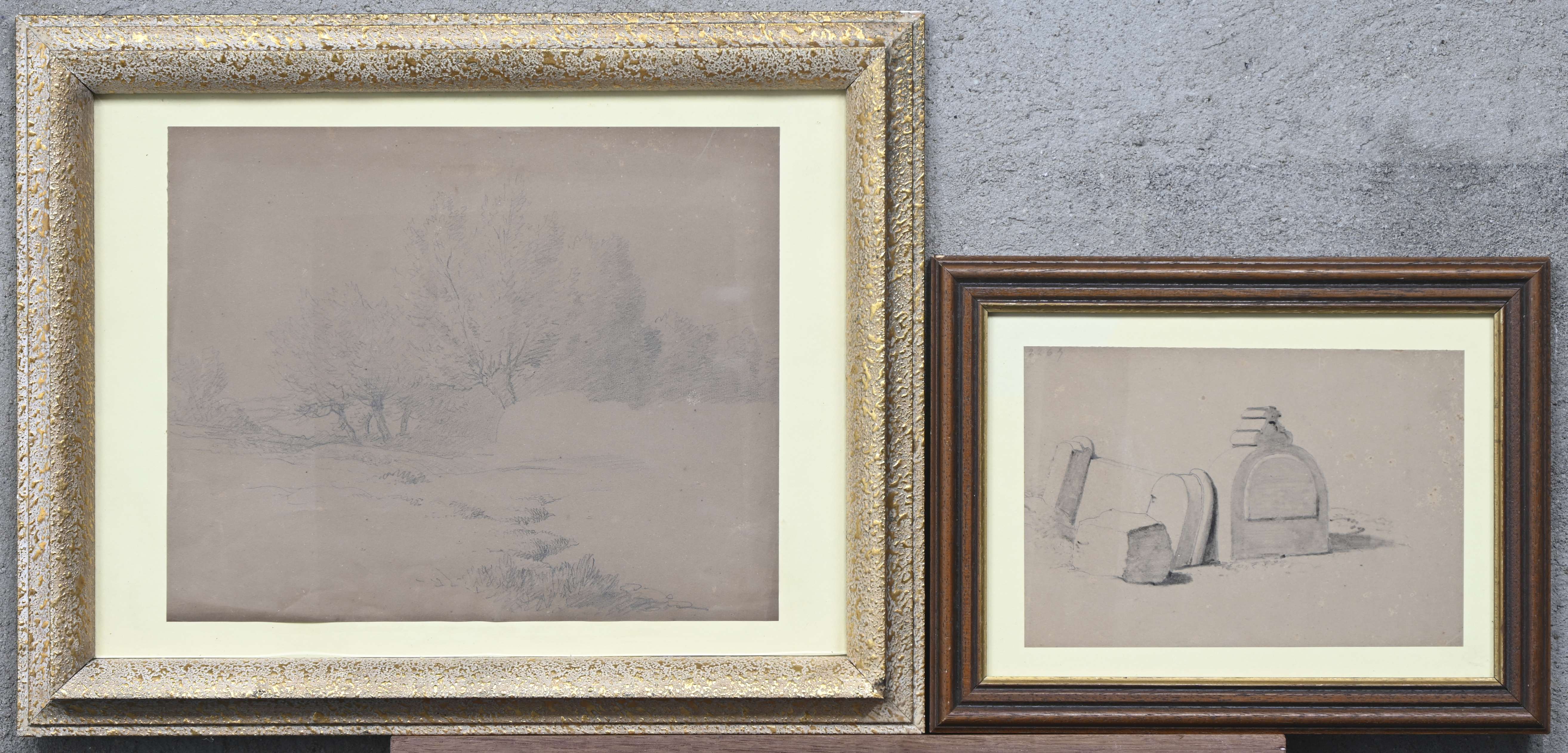‘Landscape with Willows’ and ‘Tombstones’, two pencil drawings on paper. Attributed to Eugène Verboeckhoven (1798/99-1881). With provenance written out by ABACA SRL (Association Brussels Arts and Culture Auctions).