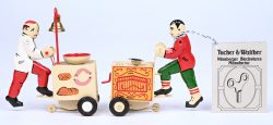 #22Nürnberger Bleichwaren Tucher & WalterTwee blikken straatvenders met een vliegwiel aangedreven karretje.