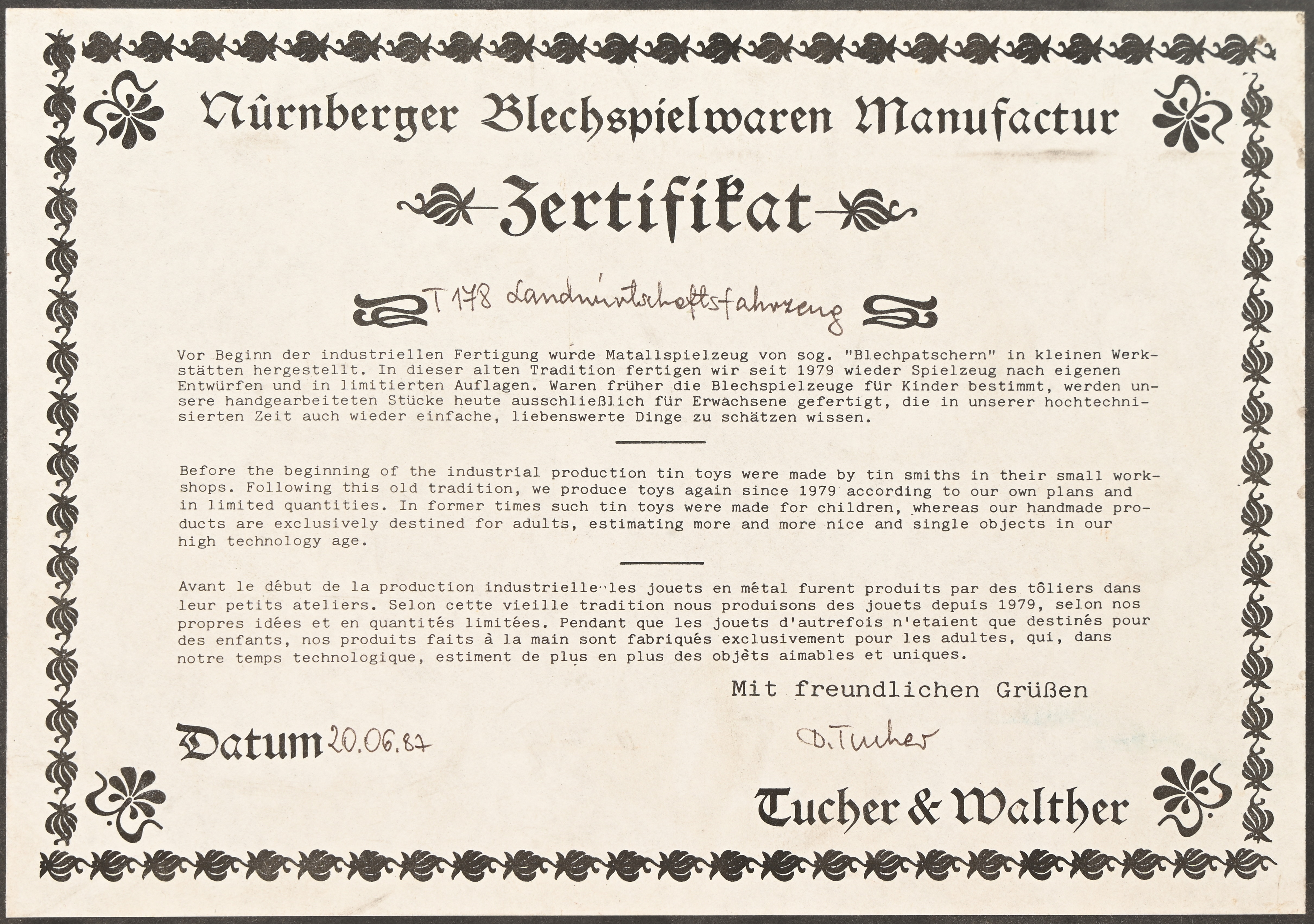 #17Nürnberger Bleichwaren Tucher & WalterPeriod: 1988‘Feuerwehr mit Anhänger’, een opwindbare blikken brandweerwagen met aanhanger. Model T-182, nr 54 uit een oplage van 400 exemplaren.
