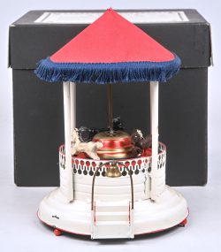 ‘Pferdekarussell mit Musik’, a tin carousel with horses. Top of the central axis and flag are missing. Model T-162, issued in a limited edition of 200 copies. With original packaging.