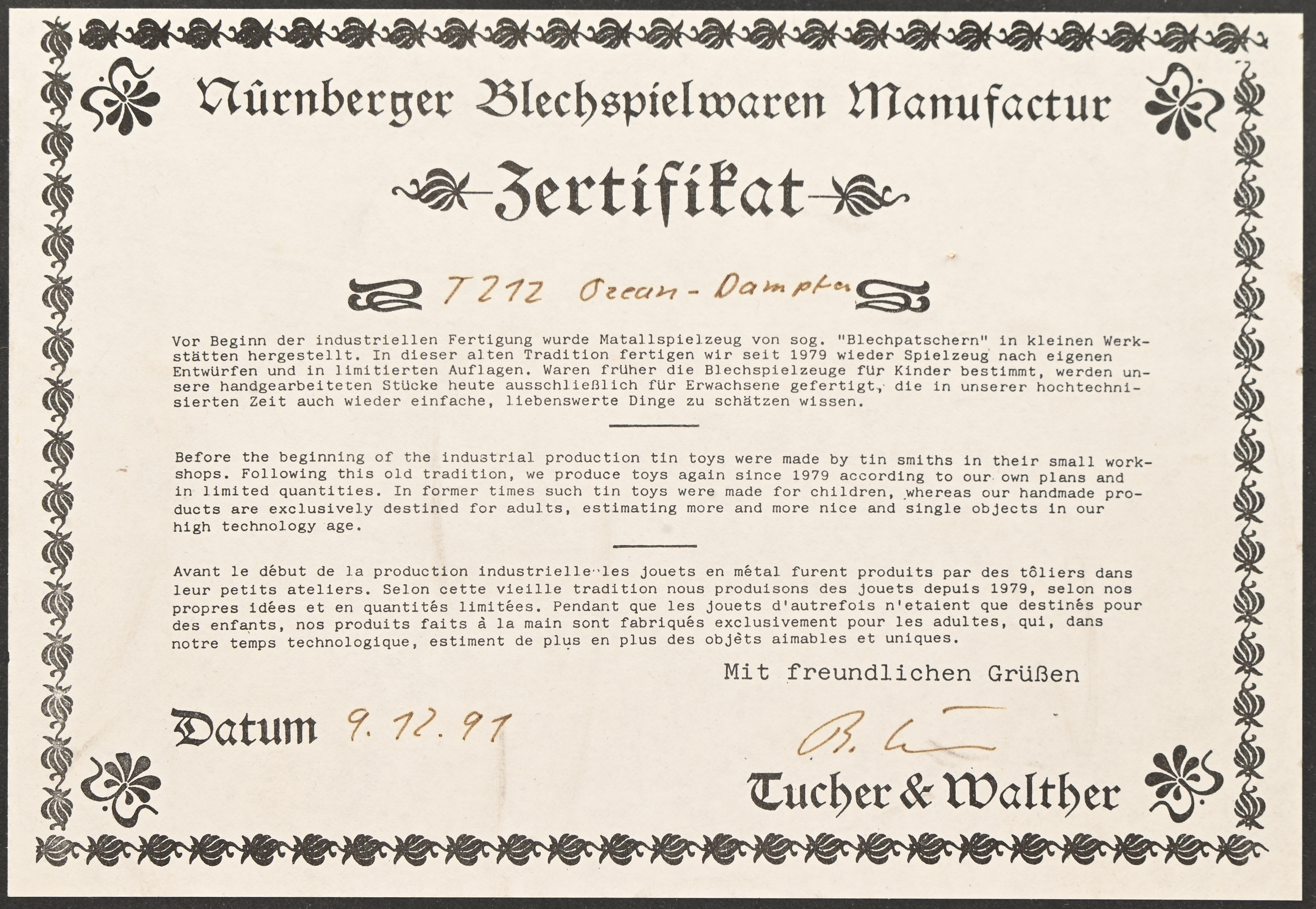 #24Nürnberger Bleichwaren Tucher & WalterEen blikken passagiersschip met werkende stoommotor, model ‘Regina’. Nr. 12 uit een oplage van 20 exemplaren.