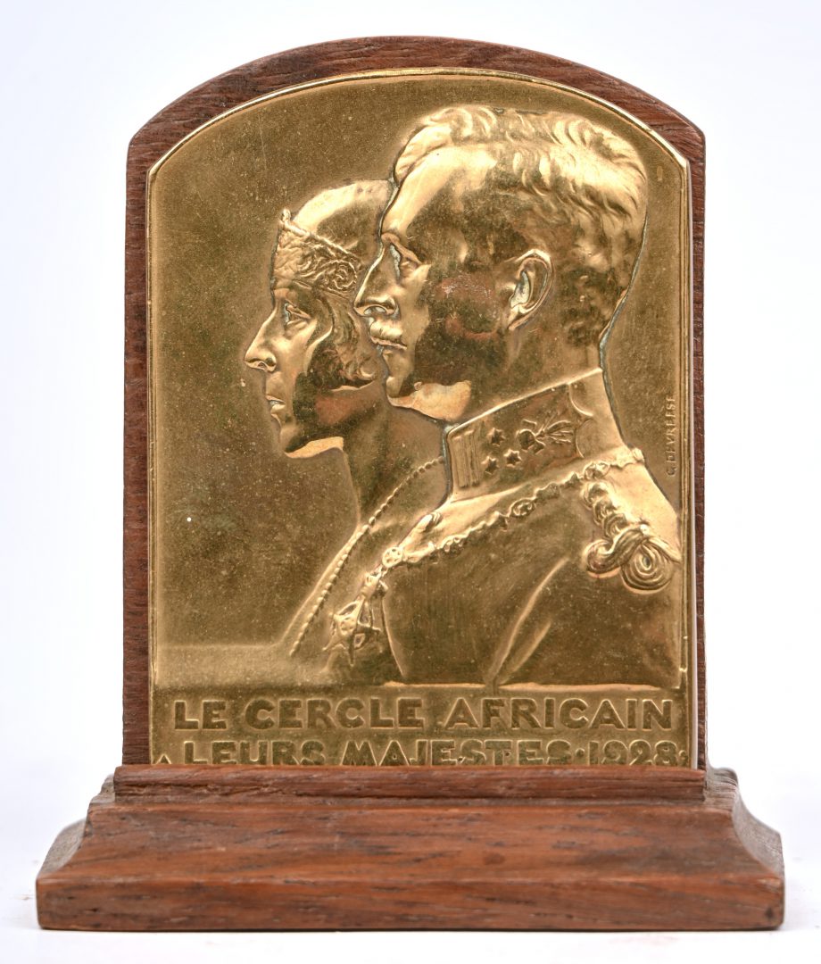 “Le Cercle Africail a Leurs Majestes - 1928”, een verguld bronzen plaquette door Jules Fonson. Op houte staandertje.