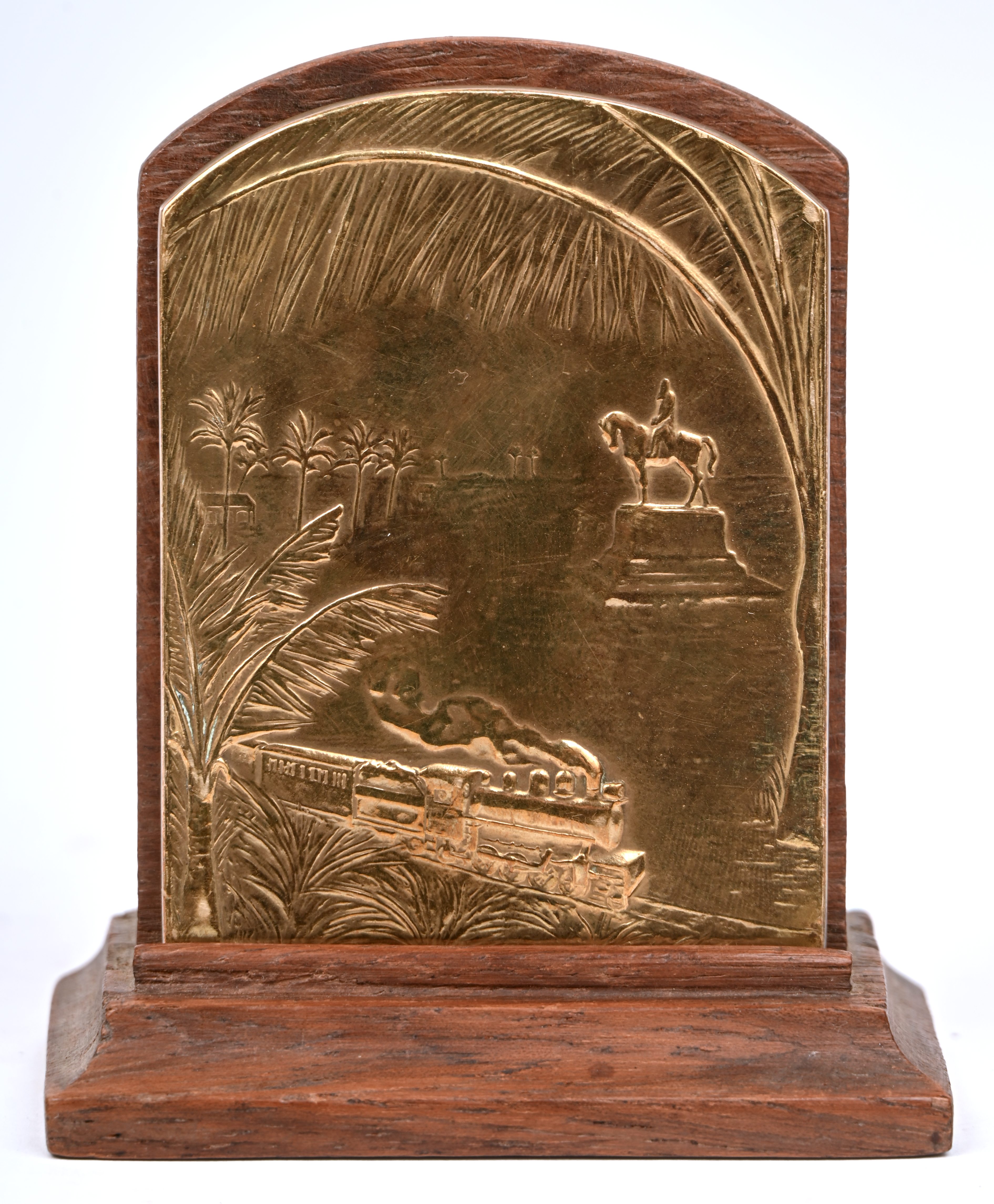 "The African Circle to Their Majesties - 1928", a gilded bronze plaque by Jules Fonson. On a wooden stand.