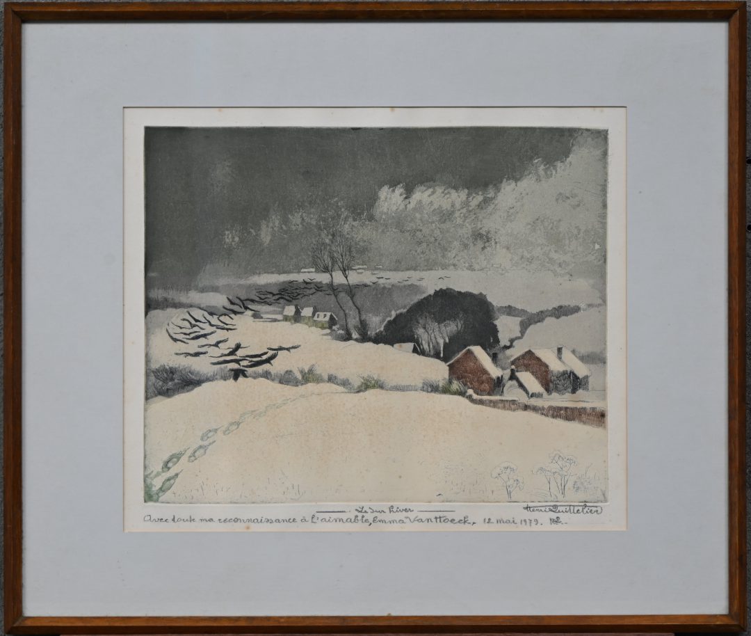 #312‘Liggend naakt’ en ‘Winterlandschap’, twee monochrome etsen getekend J. Gorus.