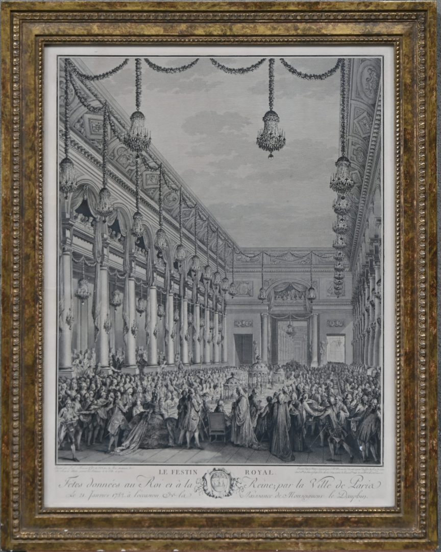 ‘’Le Festin Royal, Fètes données au Roi et la Reine, janvier 1782’. Dessiné d’apres nature et gravé par J. M. Moreau. Een 18e eeuwse gravure.