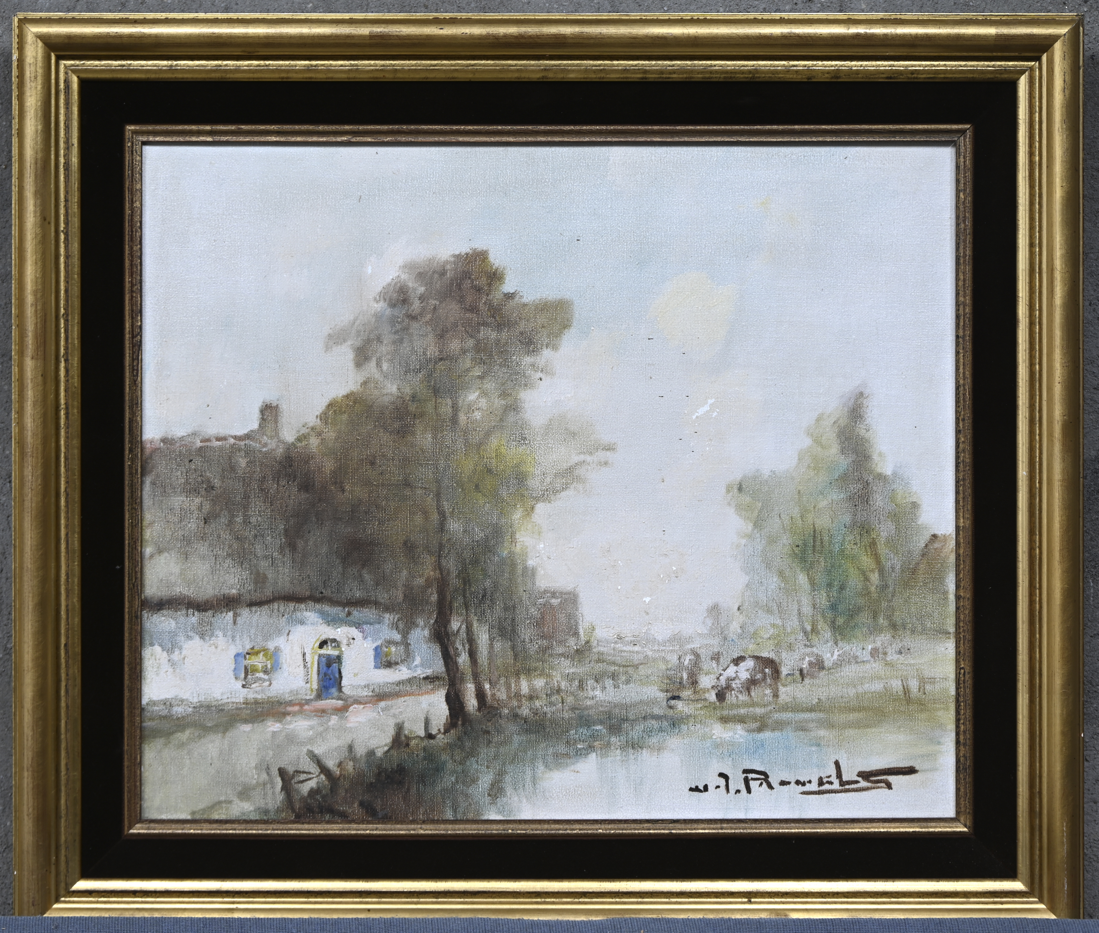 “Lentezicht met hoeve en koeien”, een schilderij, olieverf op doek in vergulde kader, gesigneerd. Verfschade.
