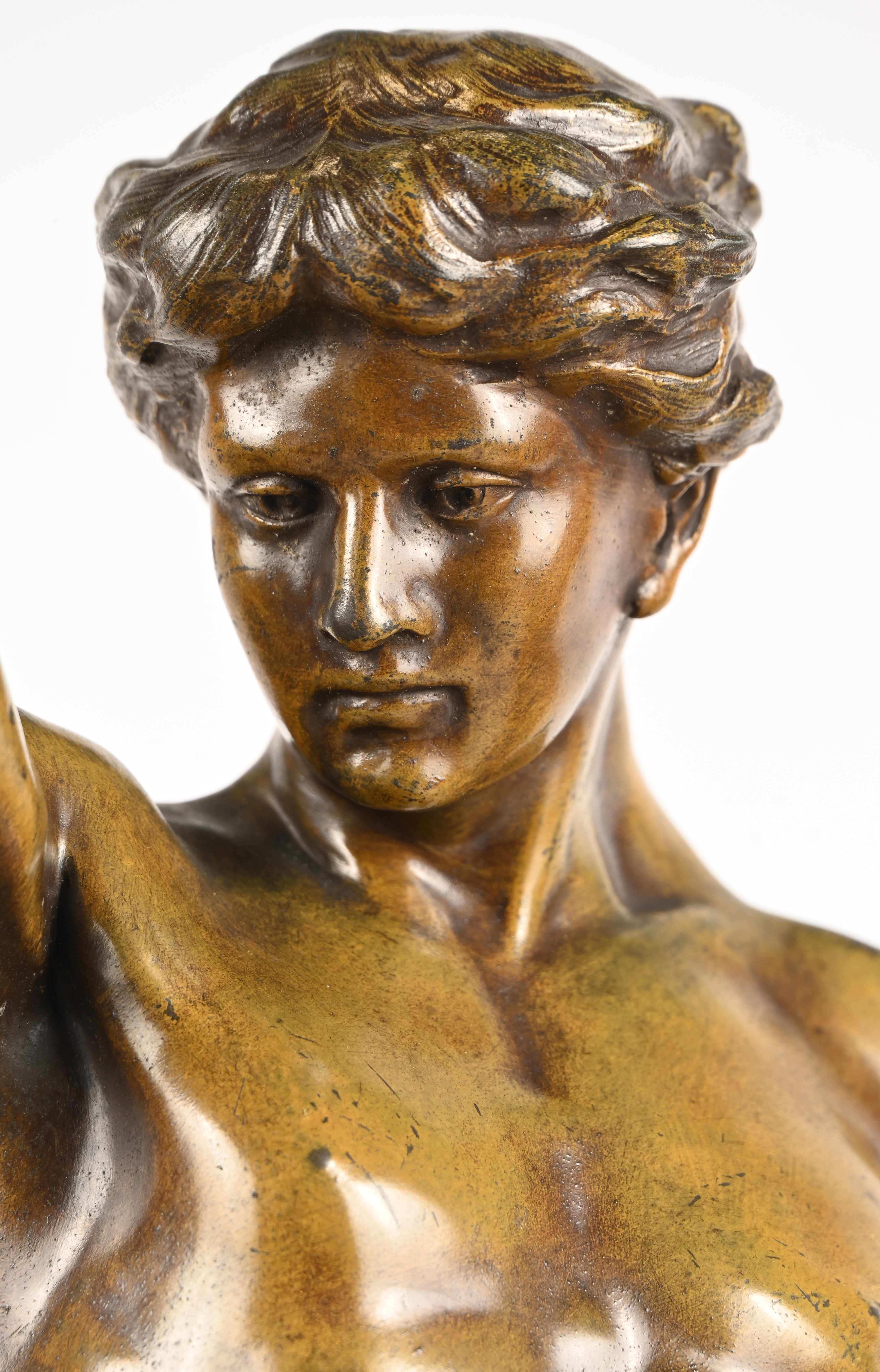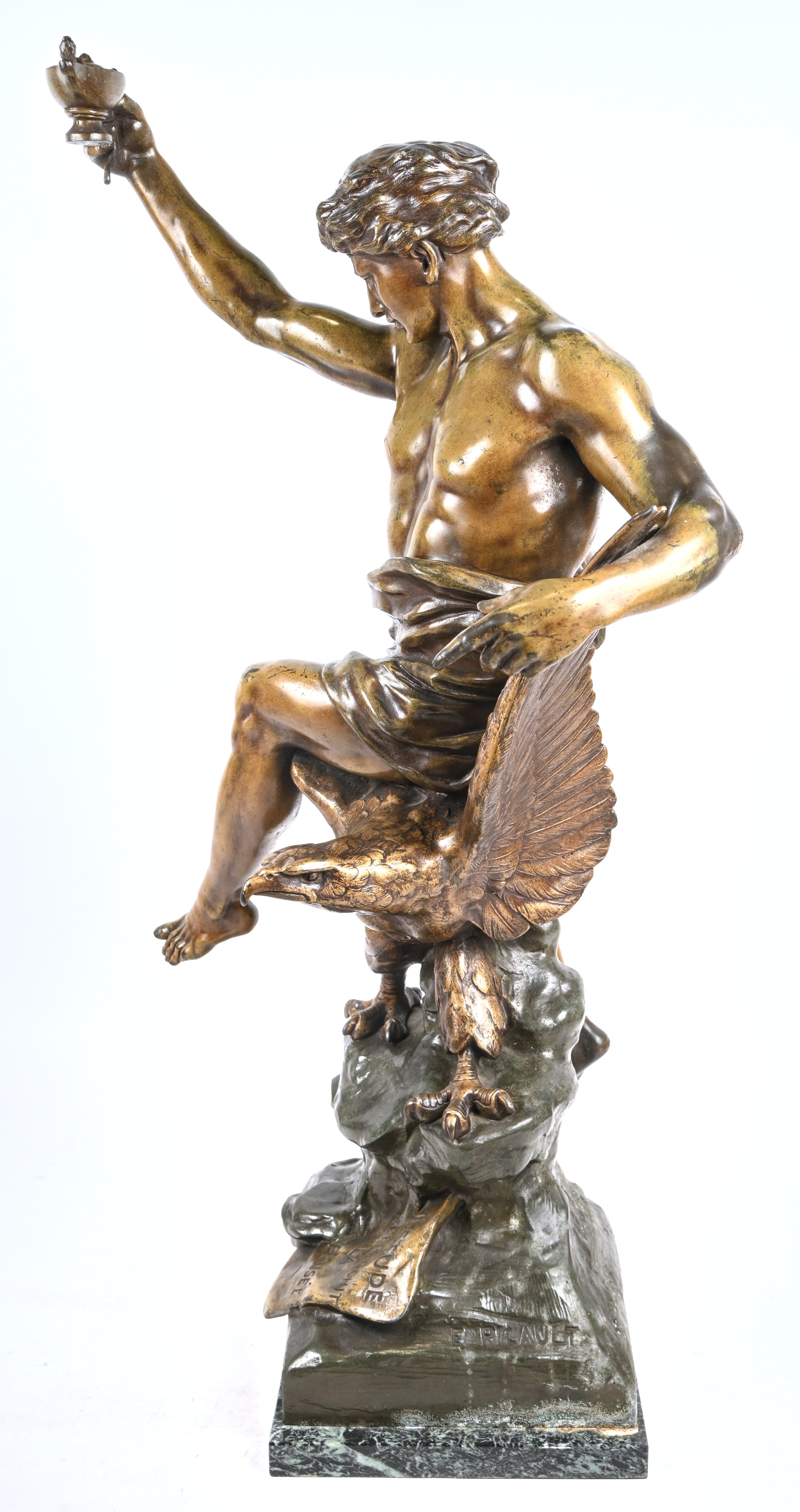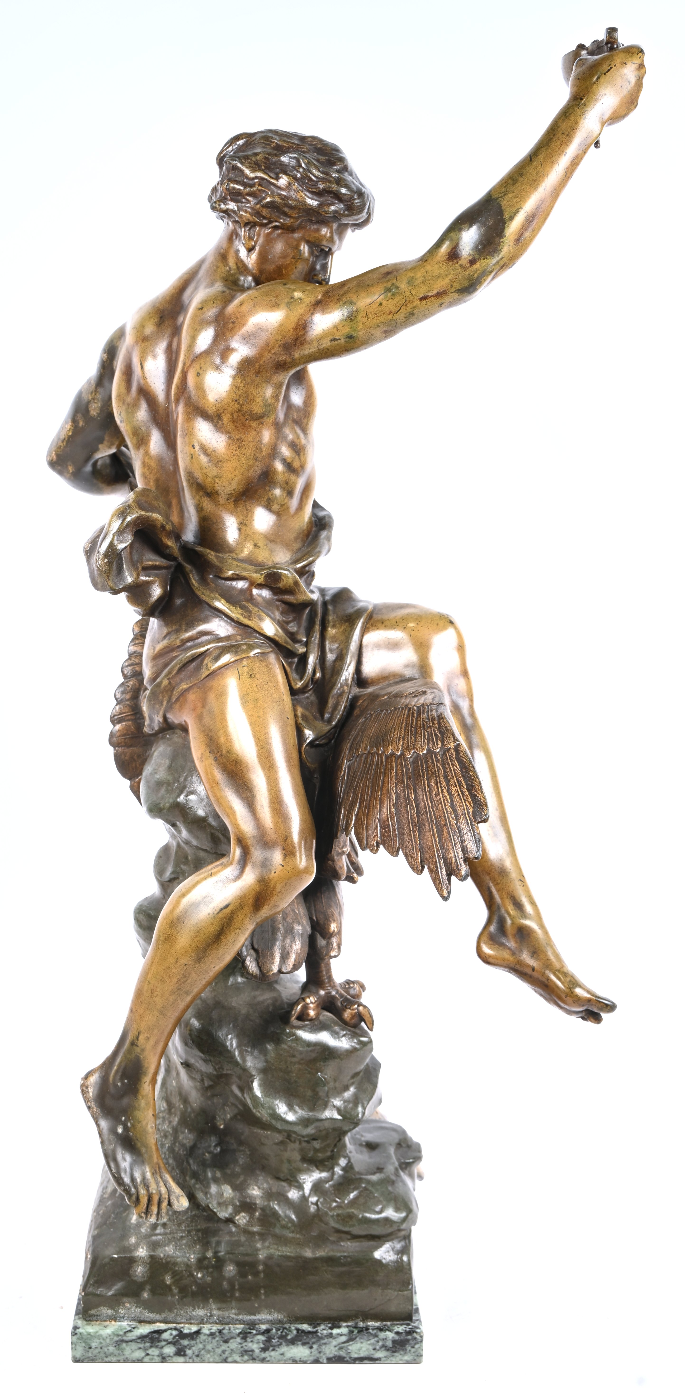 'l'étude affranchit la pensee', a patinated art bronze on a green marble base. Inspired by the work of Émile Louis Picault.