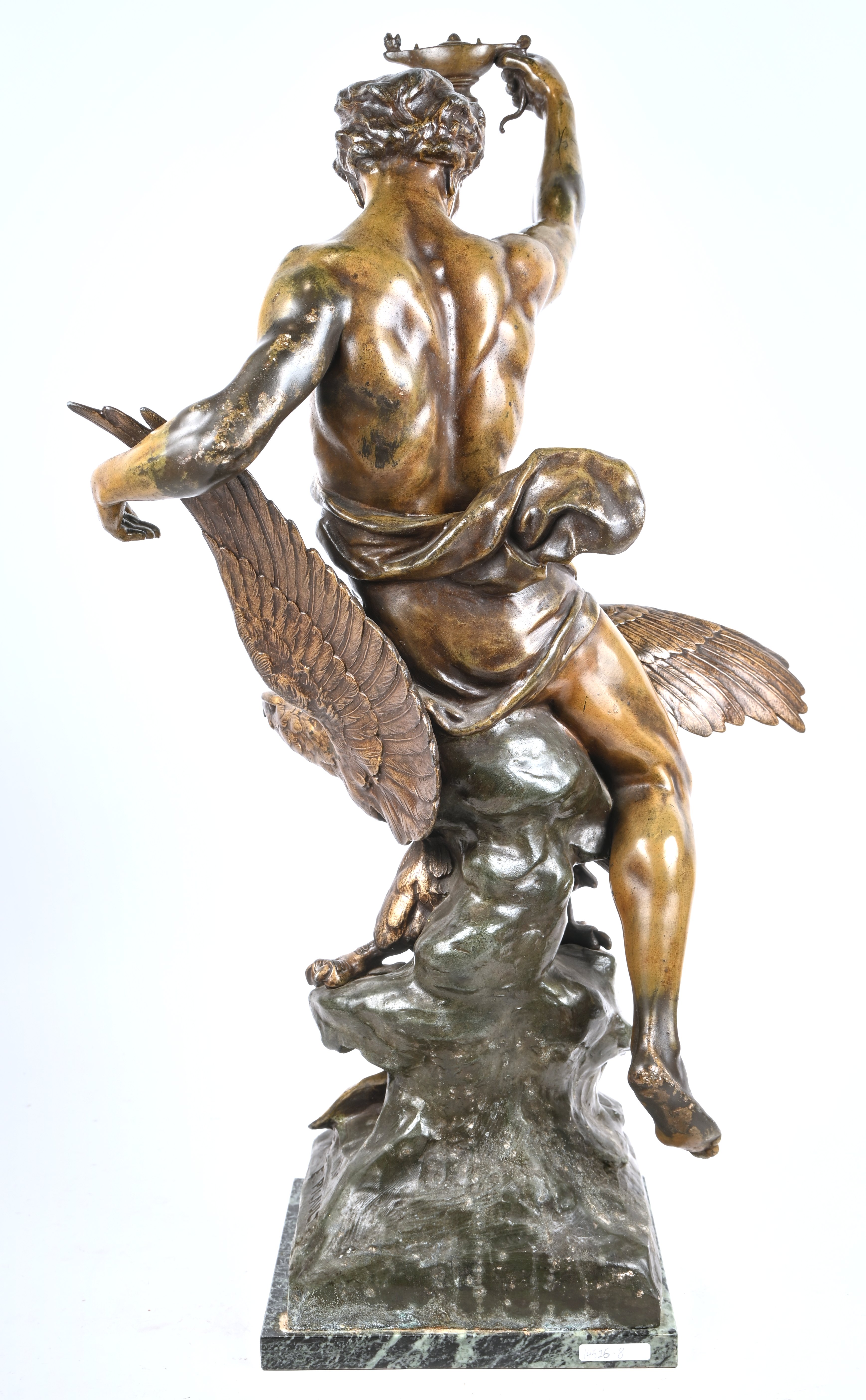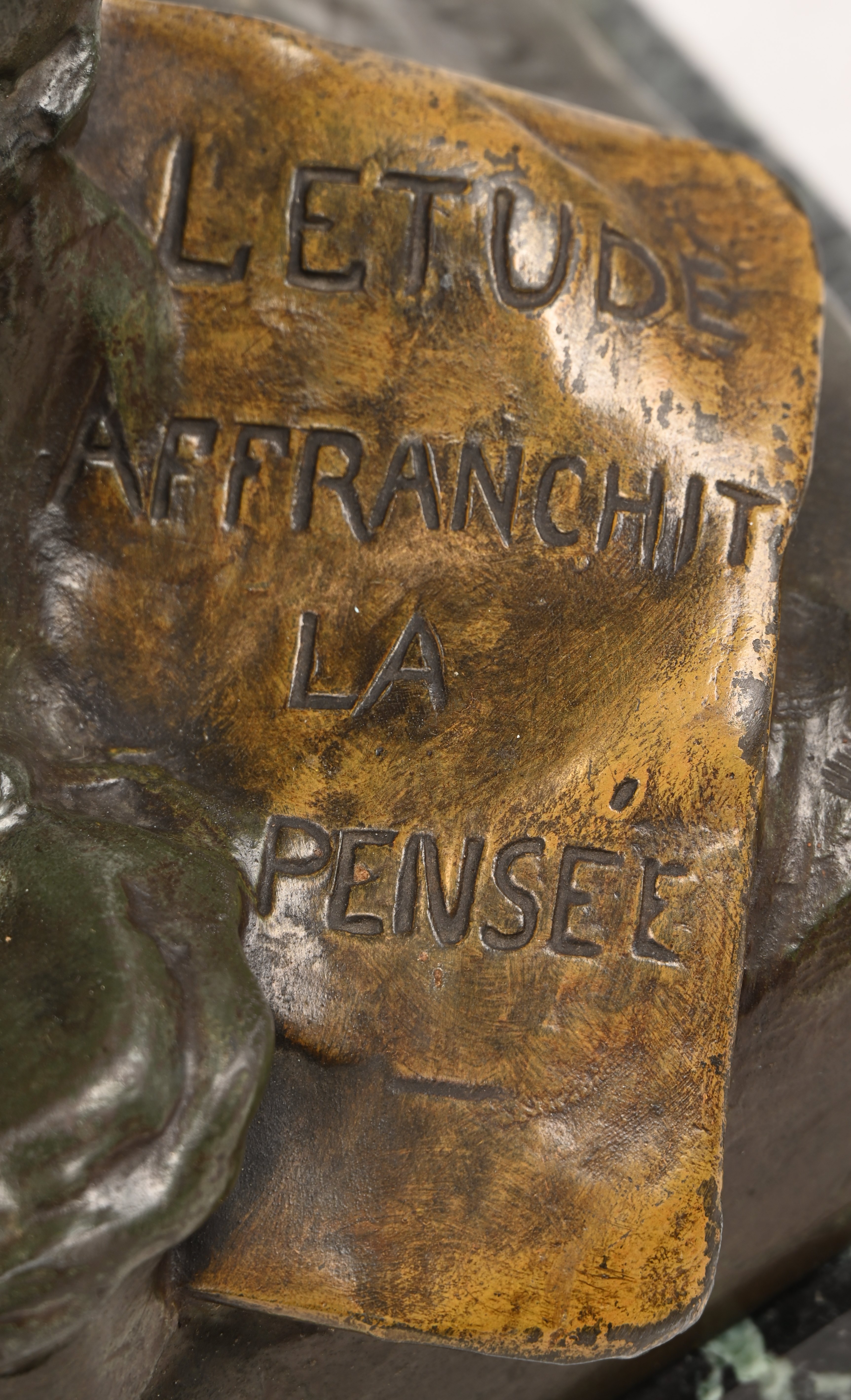 ‘l'étude affranchit la pensee’, een gepatineerde kunstbrons op een groene marmeren voet. Naar het werk van Émile Louis Picault.