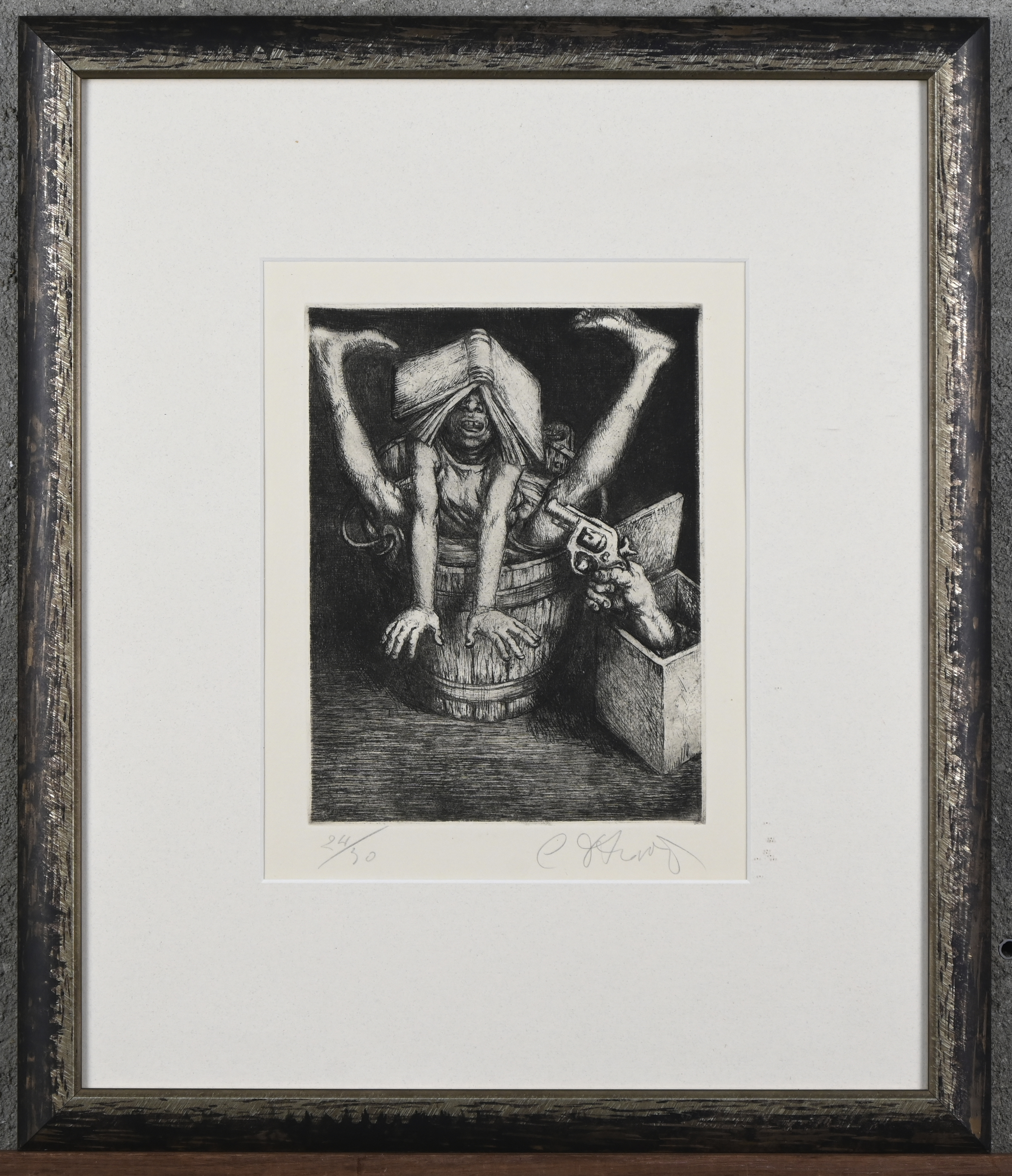 Een gevarieerd lot kaders, bestaande uit een ets, een gravure en een tekening.