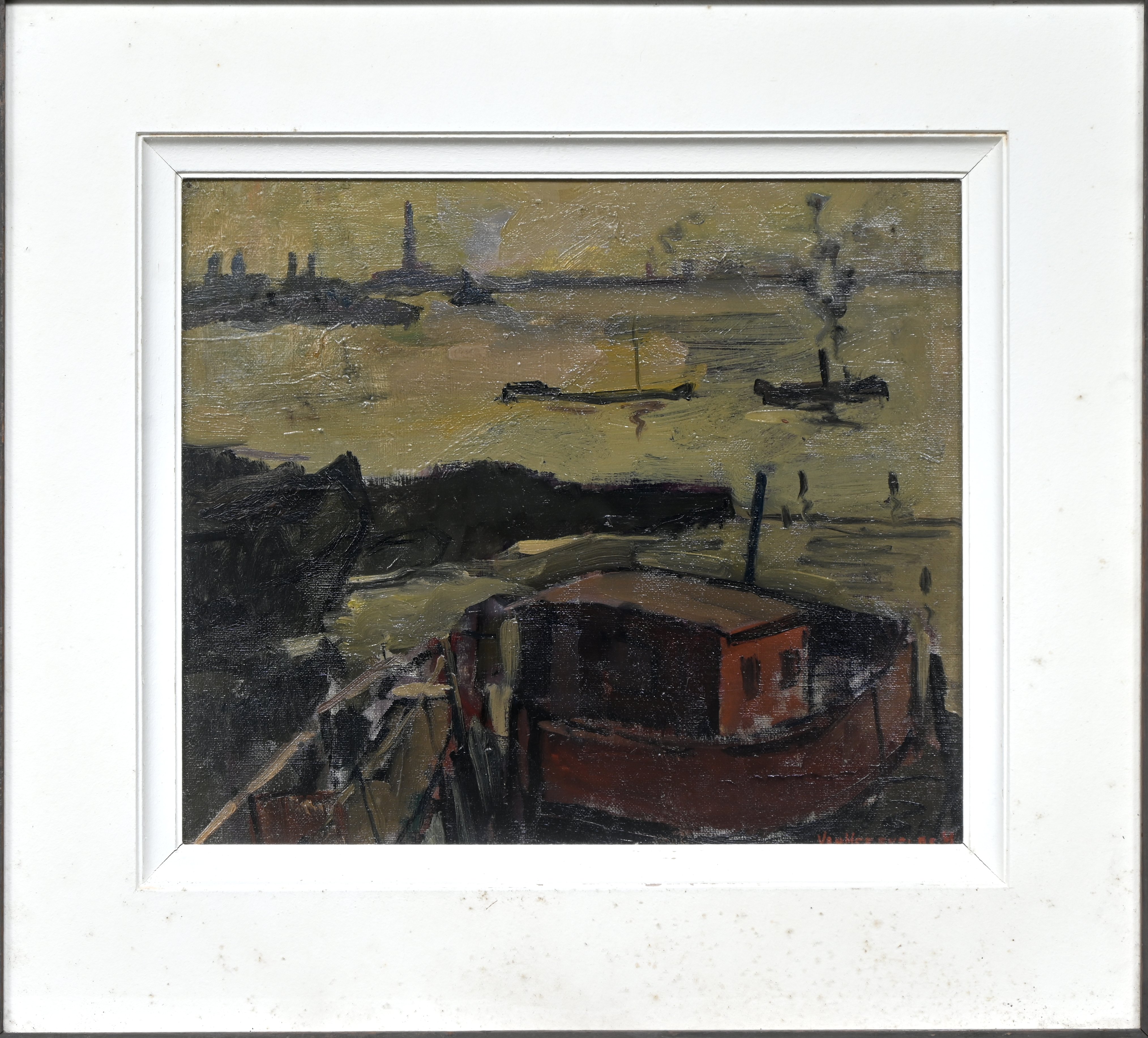 ‘Lichters op de Schelde’, olieverf op gemaroufleerd doek. Getekend Van Heesvelde H.