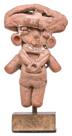 #407ChupicuaroPeriod: 500BC-300ADEen precolumbiaans beeldje van een staand figuur met een ceremoniële hoofdtooi. Met resten van polychrome beschildering. Chupicuaro, Mexico. In 1975 aangekocht bij Galerie Mermoz, Parijs.